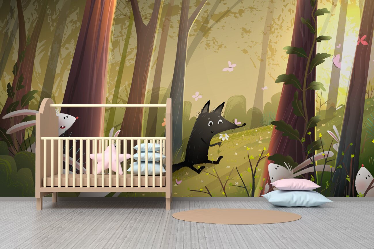 Tapeta Fototapeta Króliki obserwują wilka w lesie (artykuł a100134 ) z kategorii Fototapety dla Dzieci
