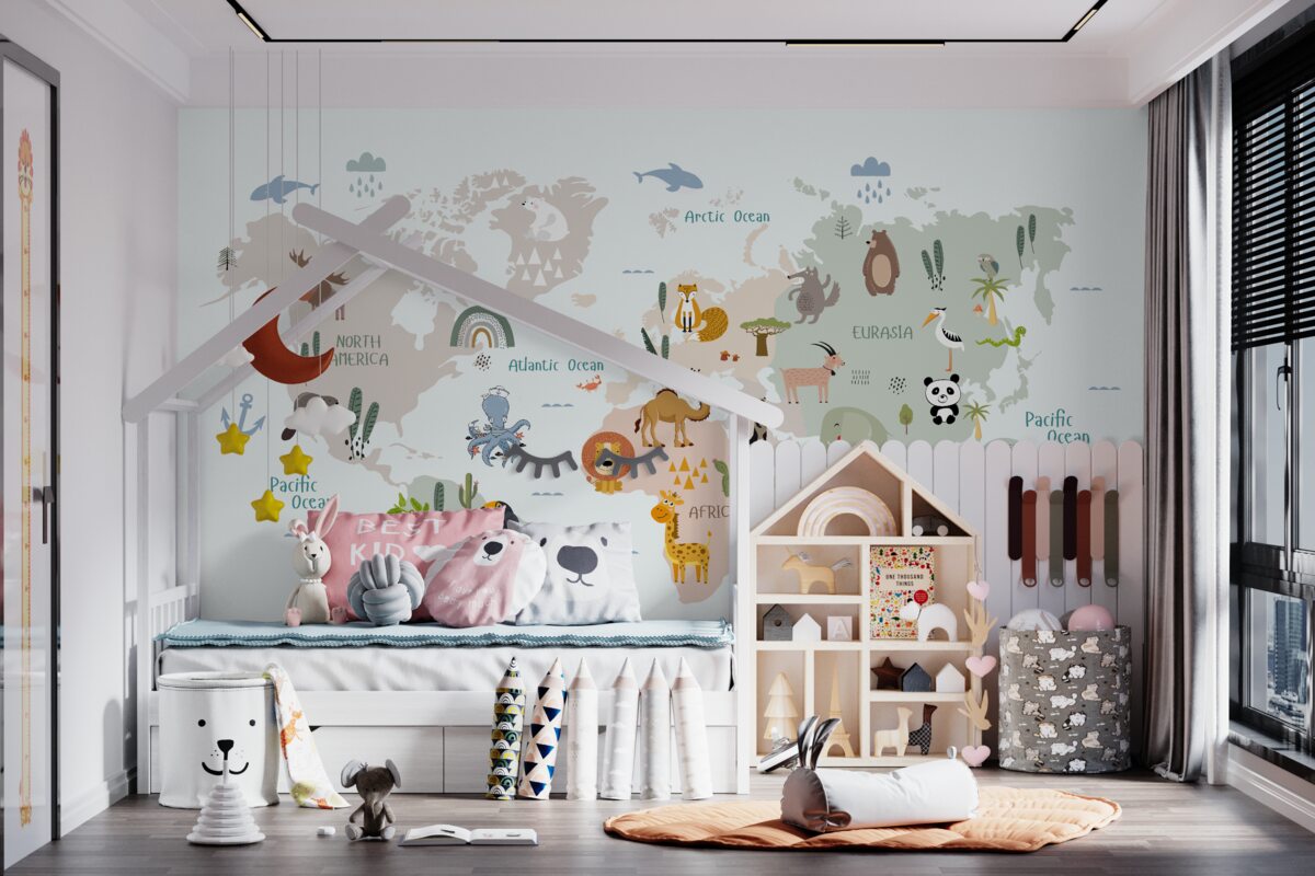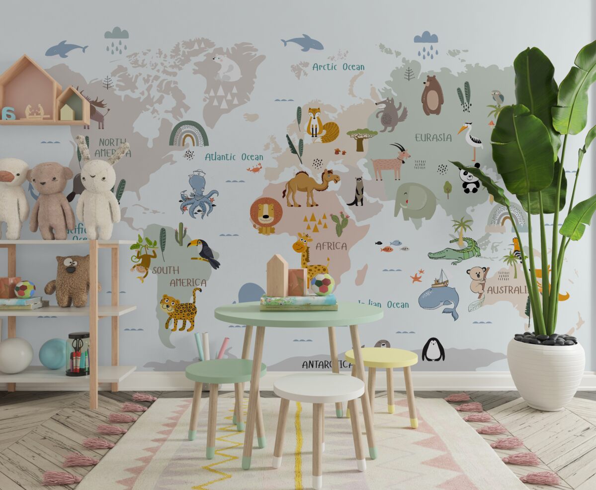 Tapeta Fototapeta Mapa świata i przedstawiciele kontynentów (artykuł a98115 ) z kategorii Fototapety dla Dzieci