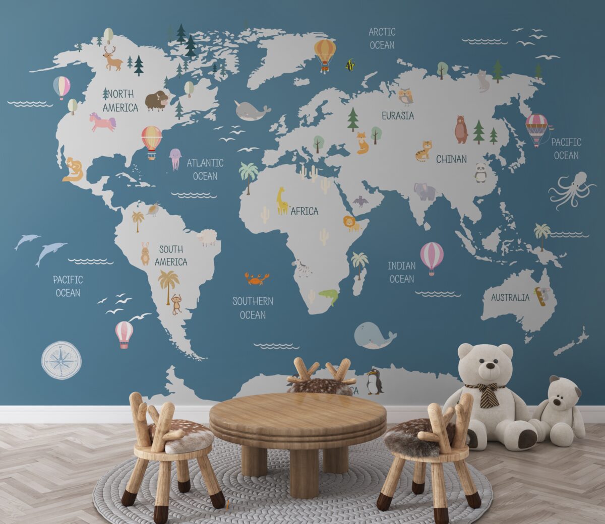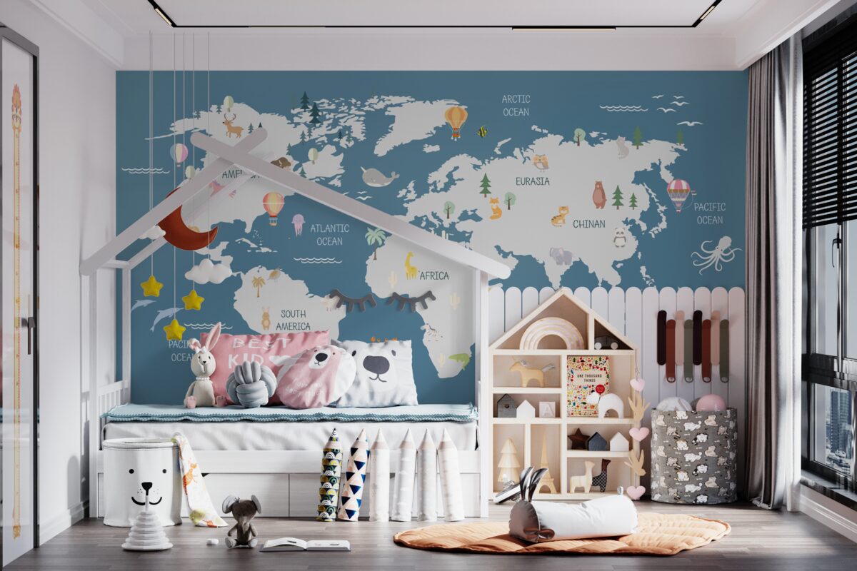 Tapeta Fototapeta Mapa świata na ciemnoniebieskim tle (artykuł a94100 ) z kategorii Fototapety dla Dzieci