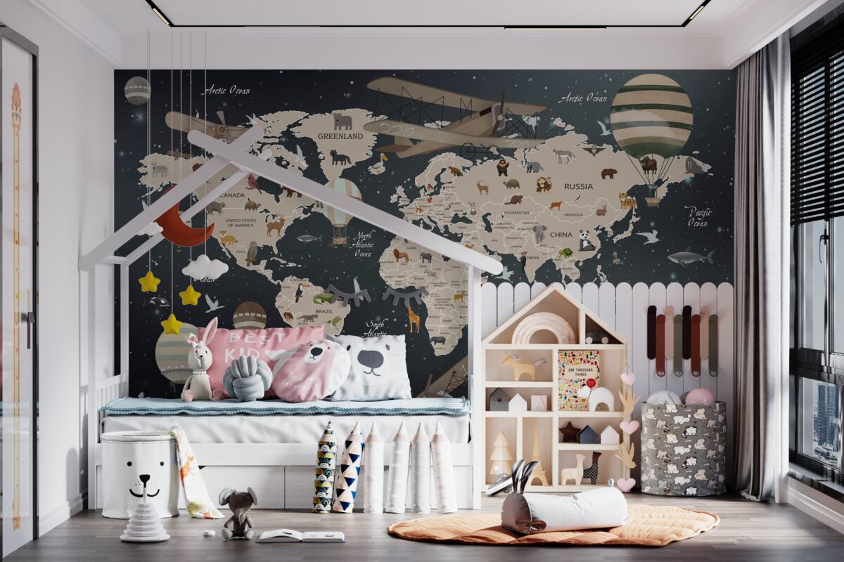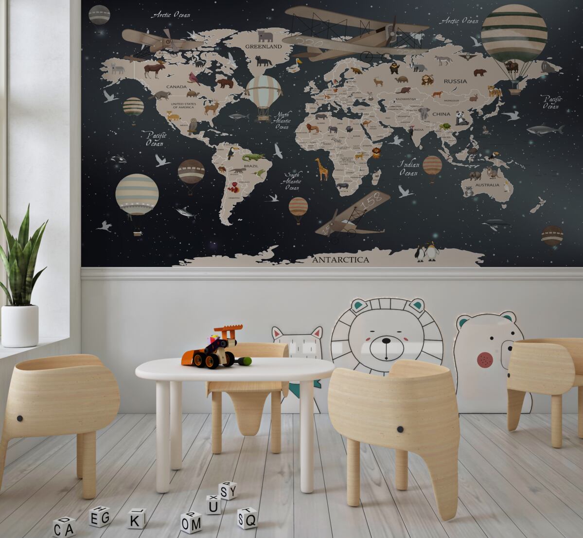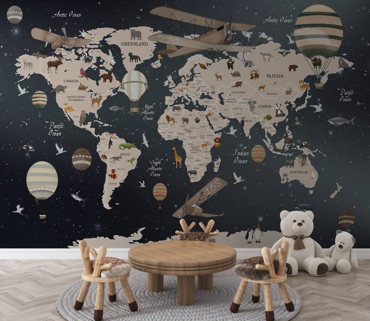 Tapeta Fototapeta Mapa świata na ciemnym tle (artykuł a98713 ) z kategorii Fototapety dla Dzieci