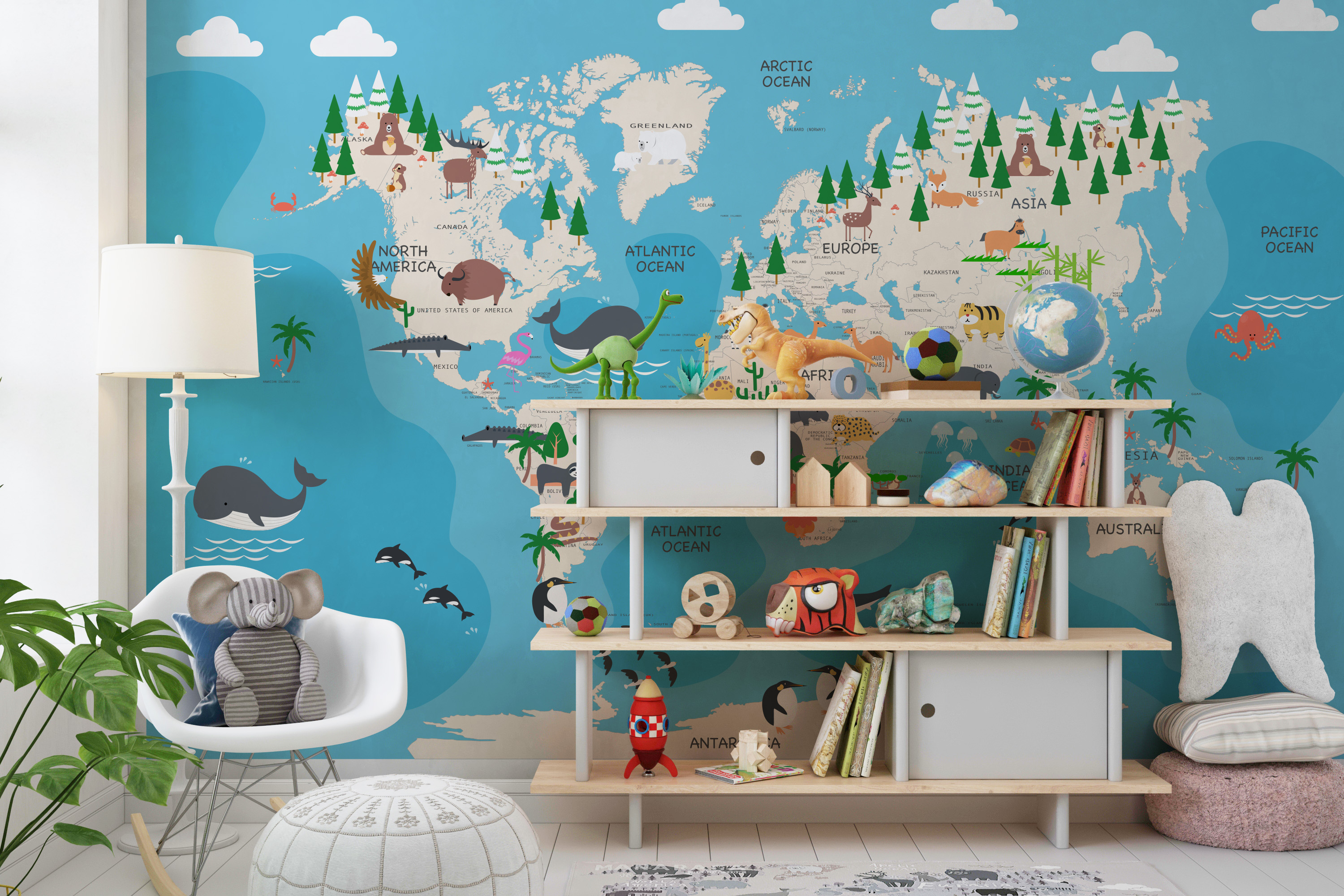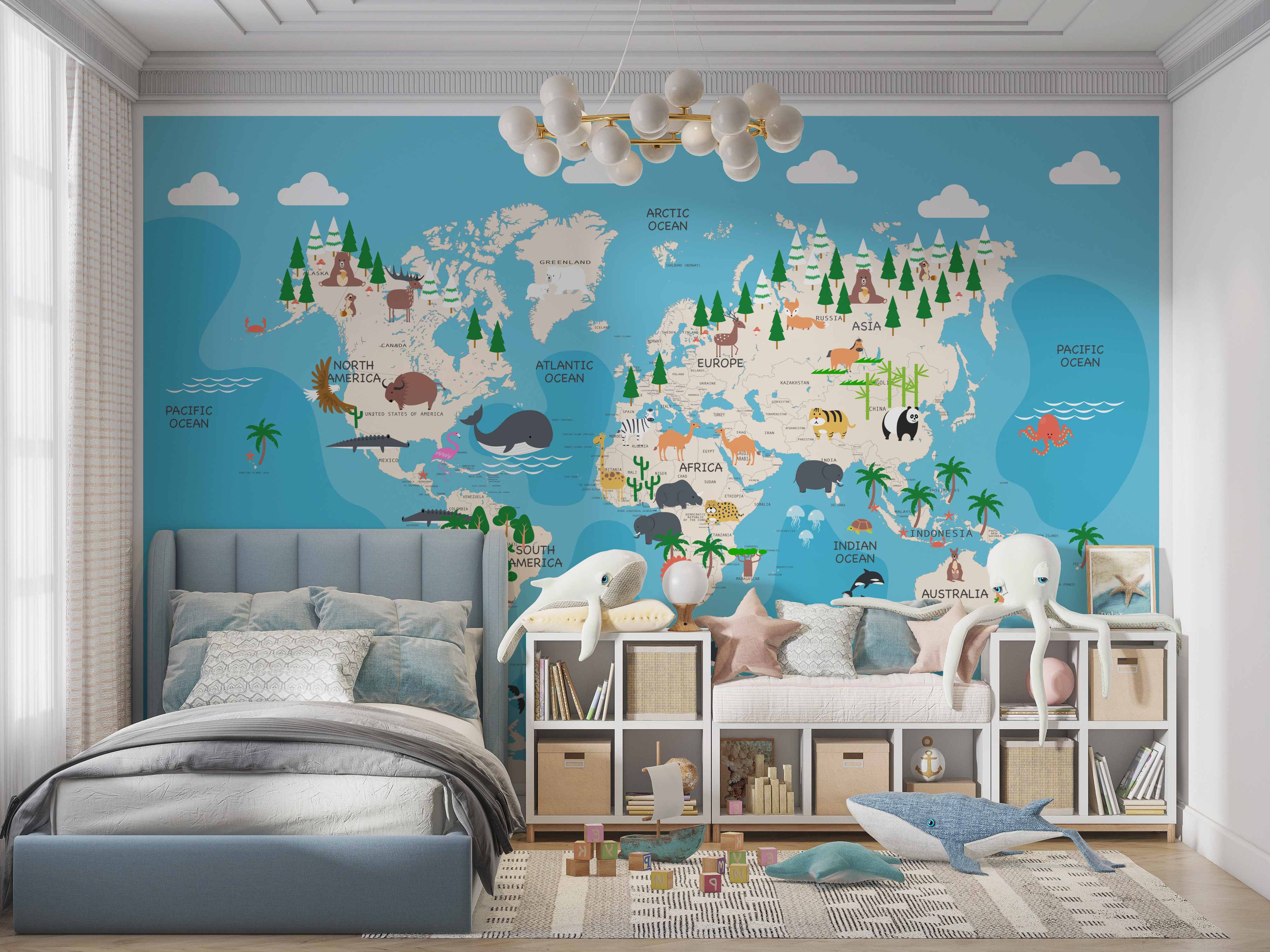 Tapeta Fototapeta Mapa świata na niebieskim tle (artykuł a94008 ) z kategorii Fototapety dla Dzieci