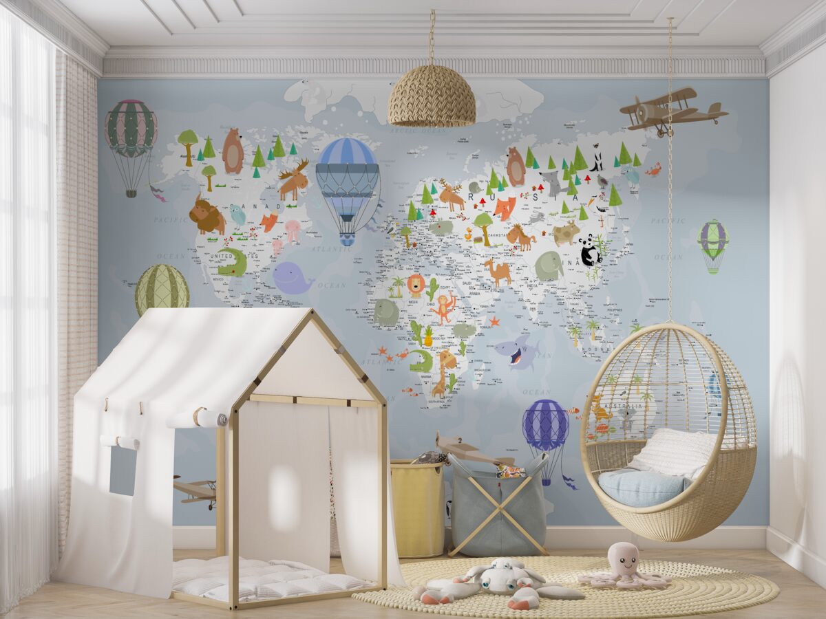 Tapeta Fototapeta Mapa świata z balonami (artykuł a98919 ) z kategorii Fototapety dla Dzieci