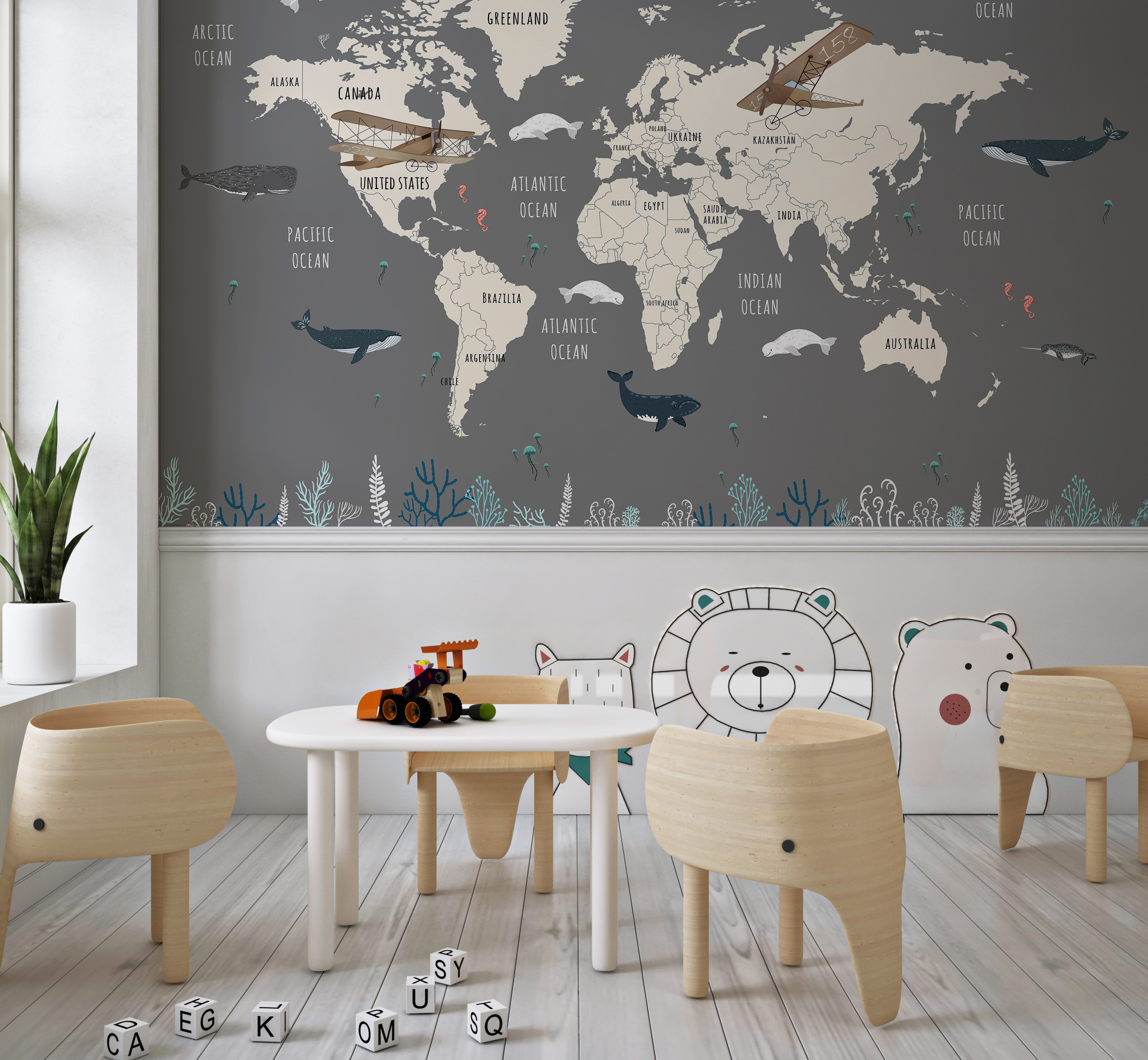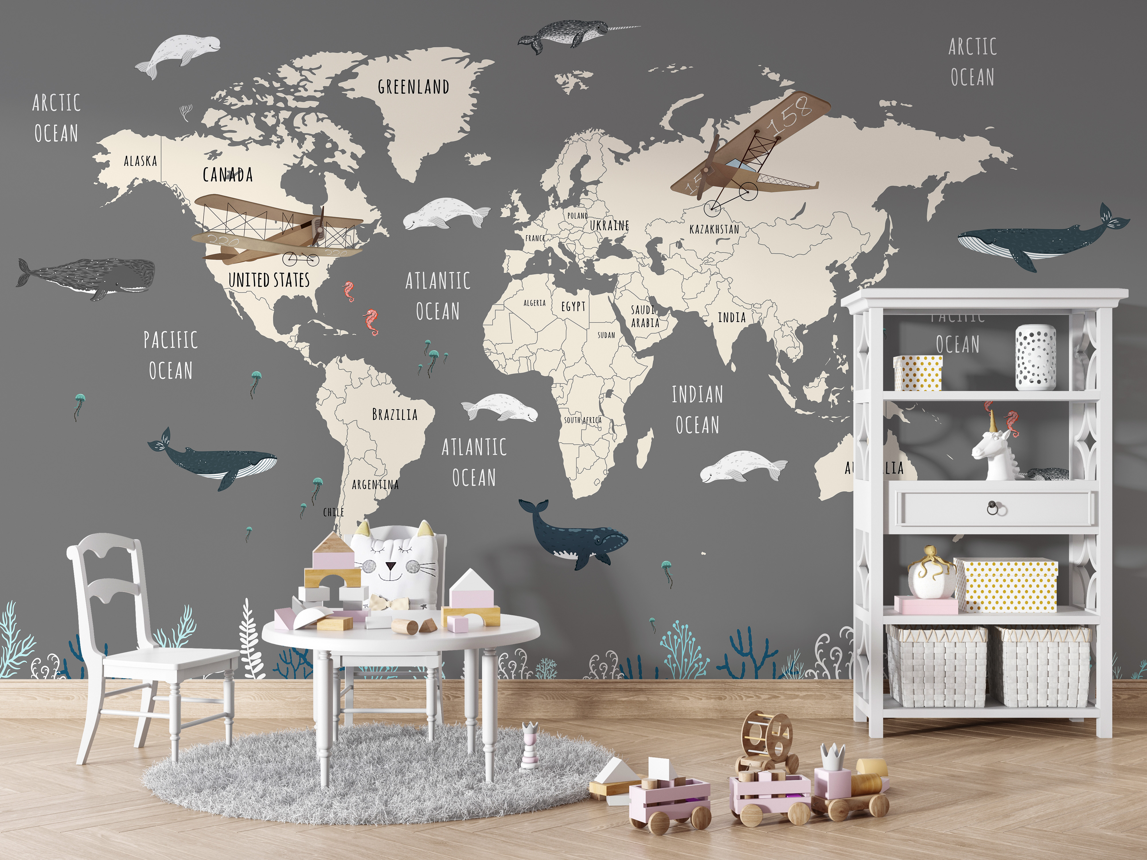 Tapeta Fototapeta Mapa świata z podwodnymi zwierzętami (artykuł a94033 ) z kategorii Fototapety dla Dzieci