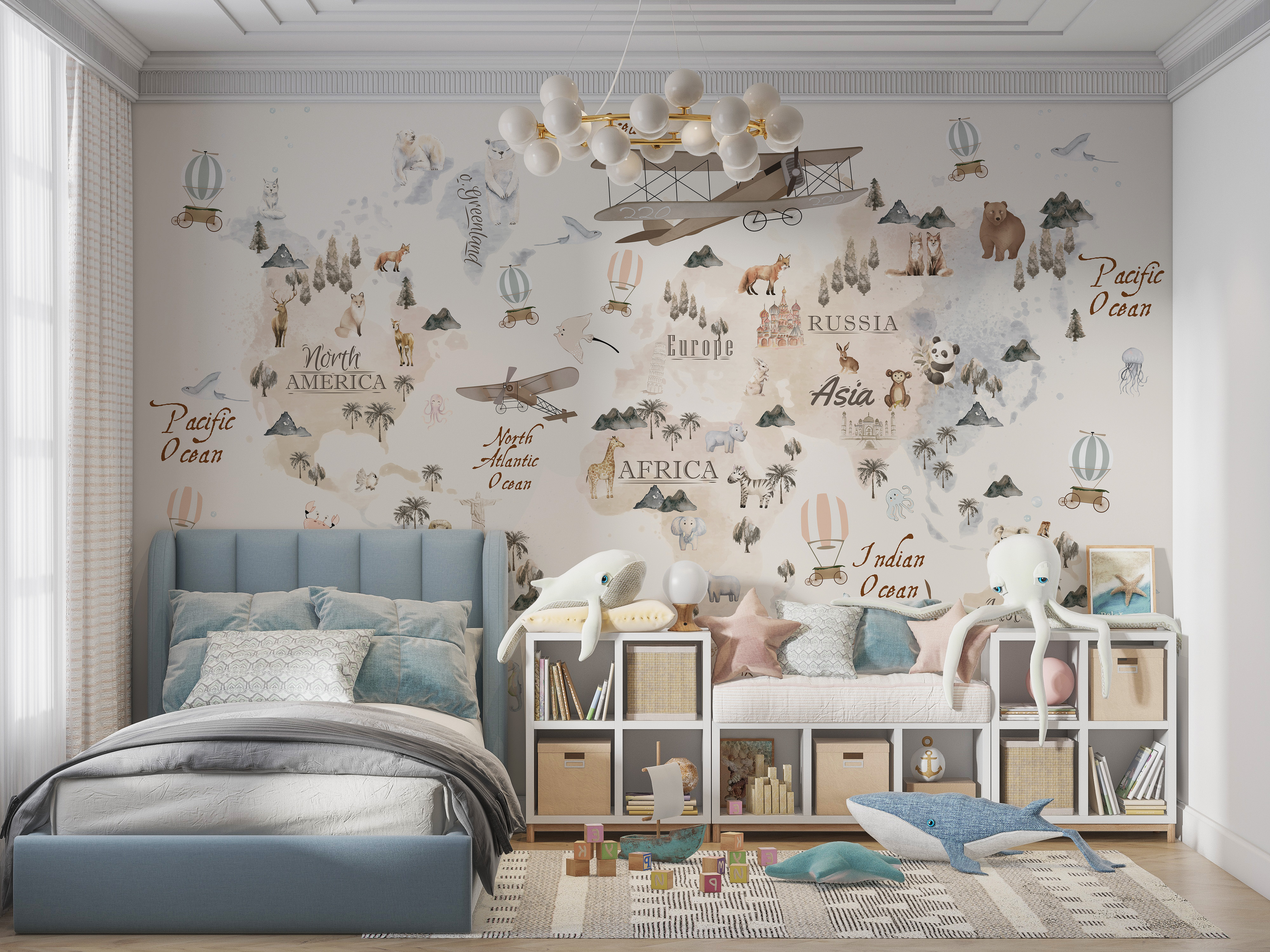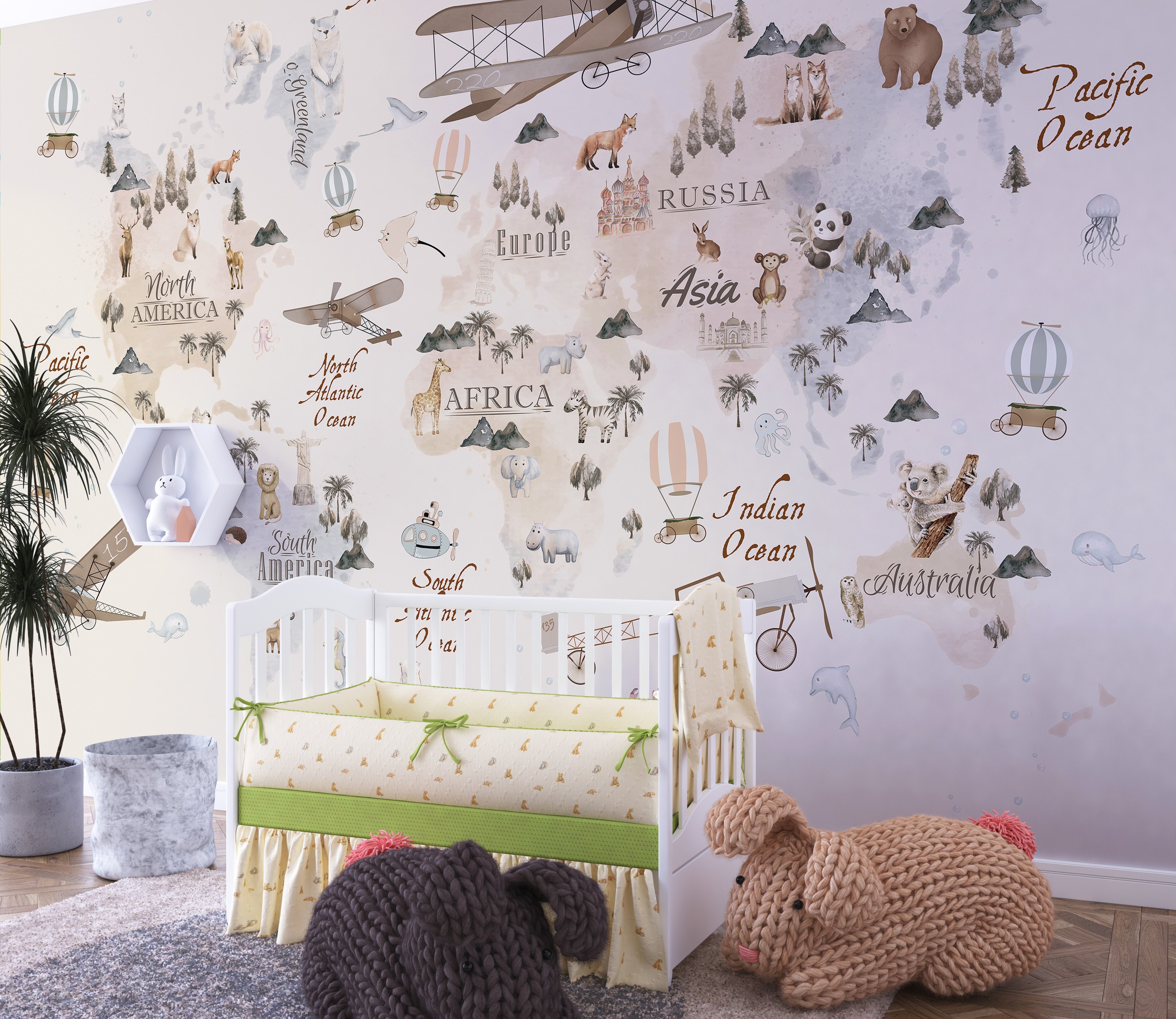 Tapeta Fototapeta Mapa świata z różnymi zwierzętami i transportem (artykuł a94029 ) z kategorii Fototapety dla Dzieci