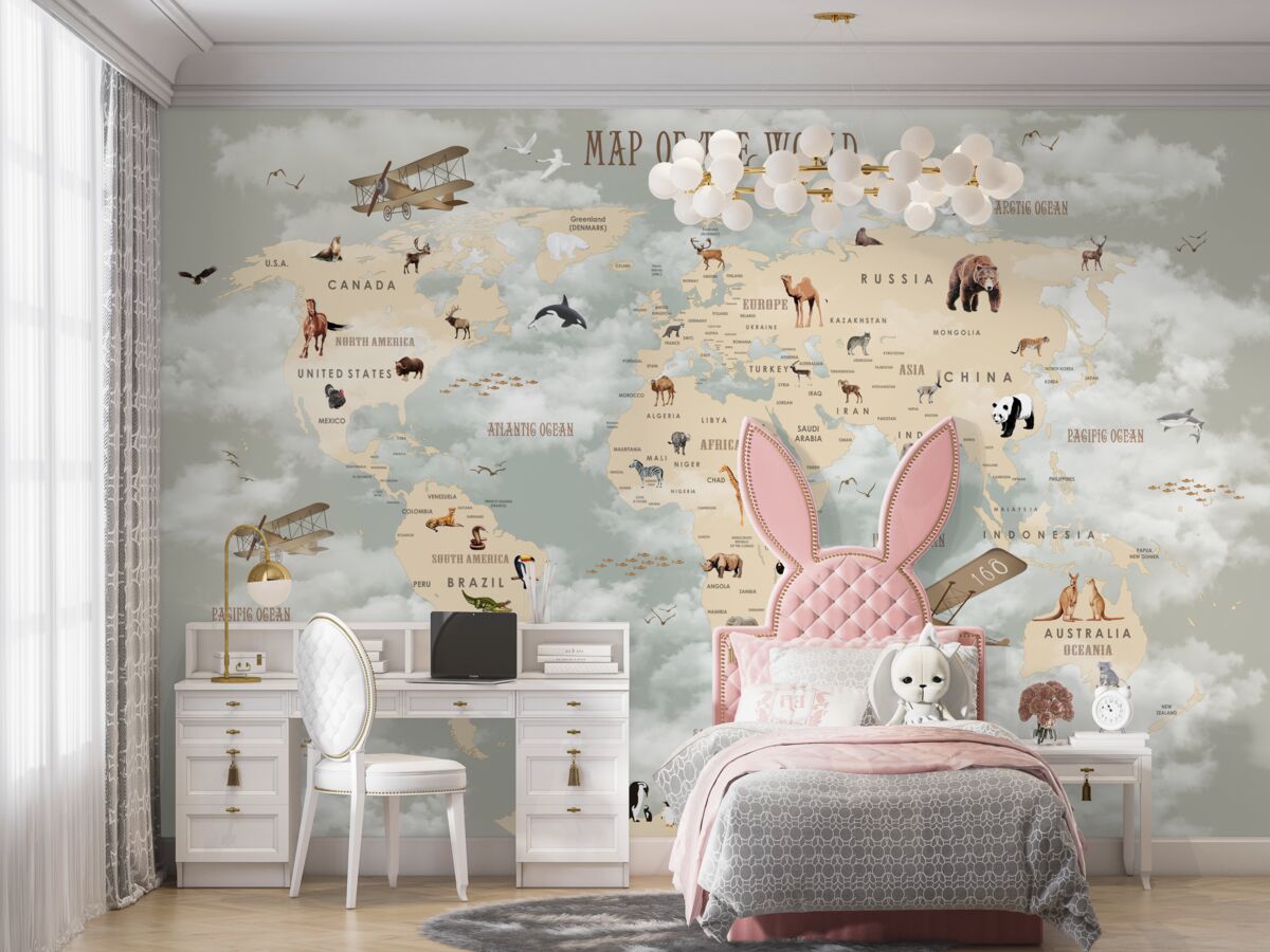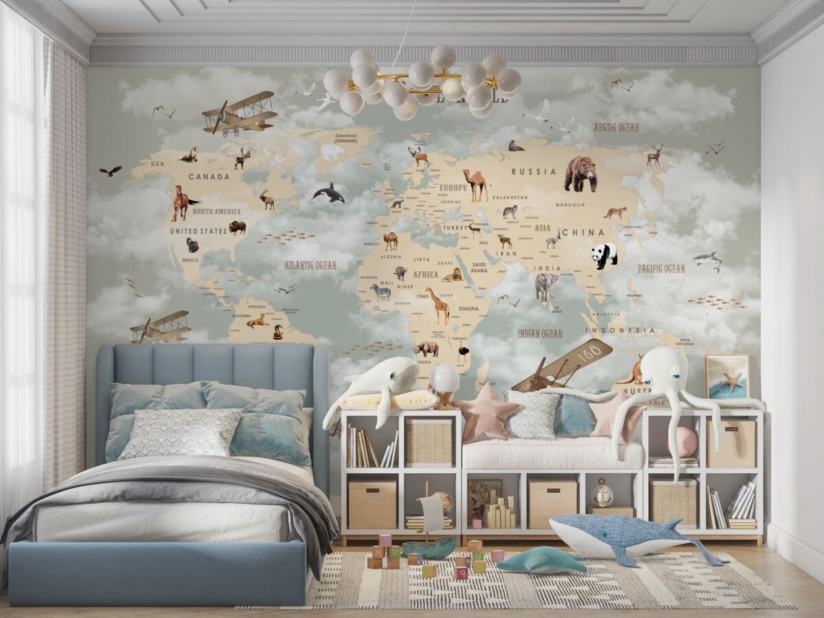 Tapeta Fototapeta Mapa świata ze szczegółami dotyczącymi zwierząt i transportu (artykuł a96654 ) z kategorii Fototapety dla Dzieci