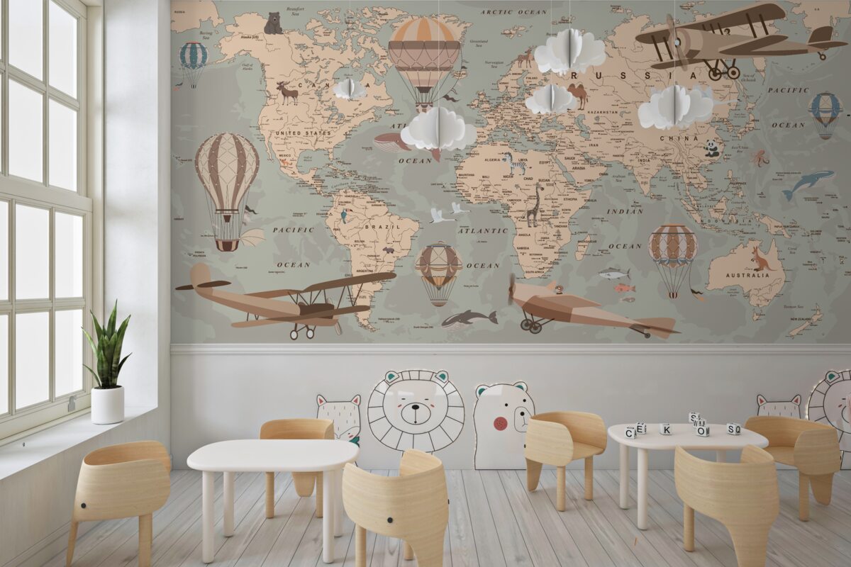 Tapeta Fototapeta Mapa świata ze zwierzętami i transportem (artykuł a98710 ) z kategorii Fototapety dla Dzieci