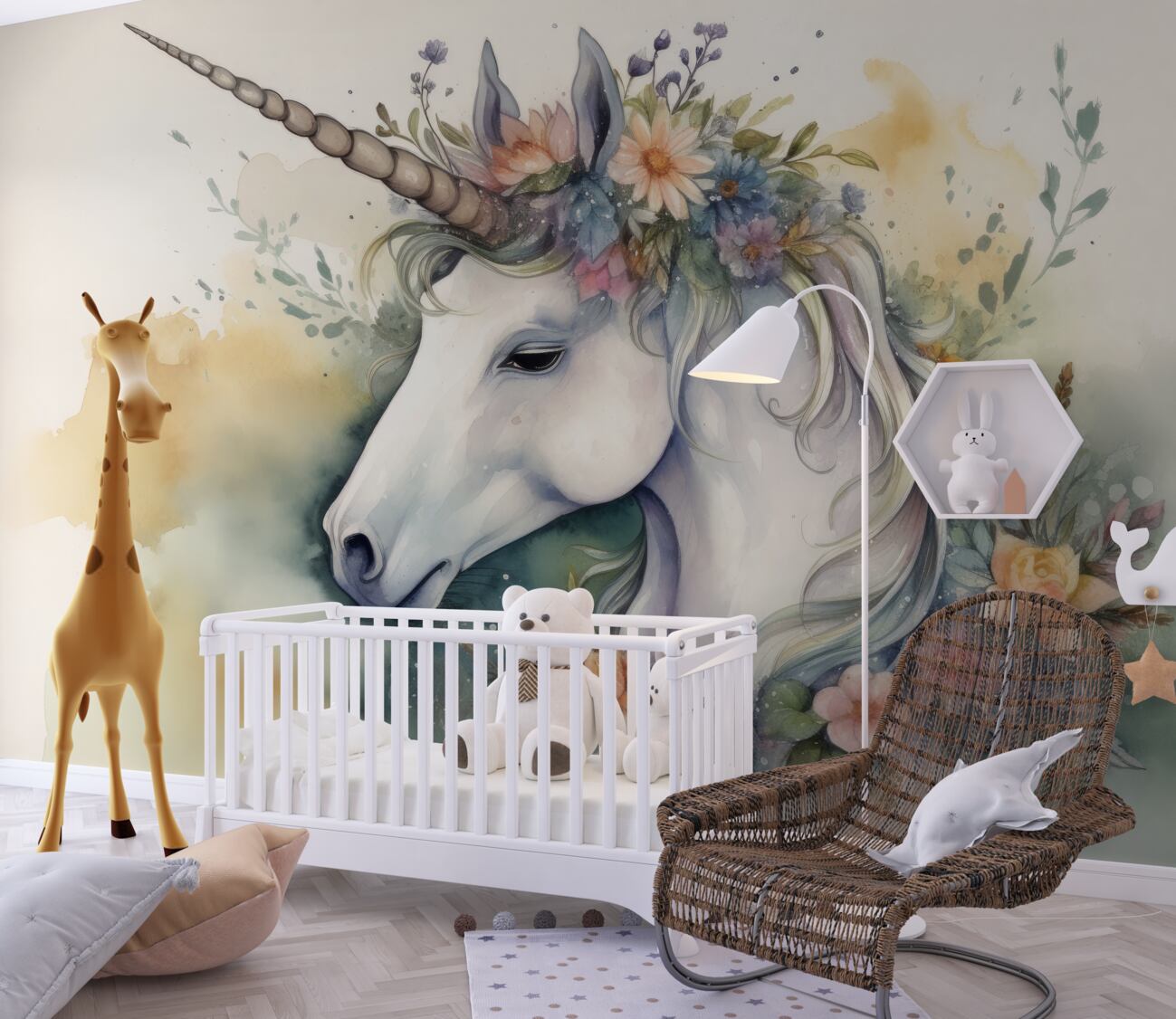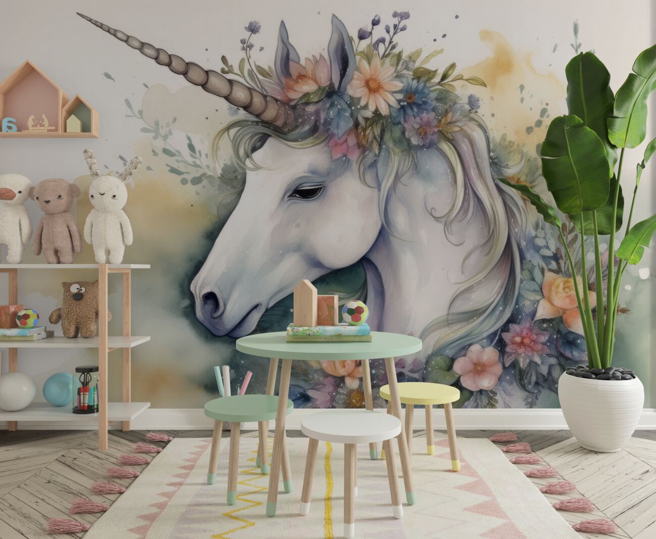 Tapeta Fototapeta Narysowany jednorożec z kwiatami (artykuł a100105 ) z kategorii Fototapety dla Dzieci