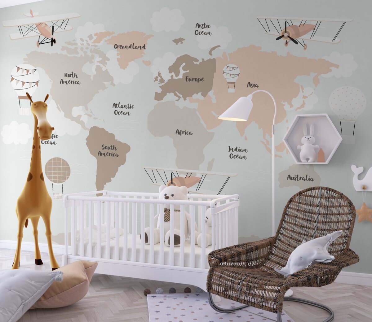 Tapeta Fototapeta Nazwy kontynentów na mapie świata (artykuł a98083 ) z kategorii Fototapety dla Dzieci