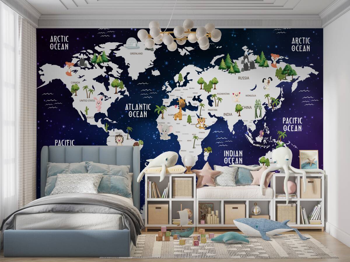 Tapeta Fototapeta Nocna mapa świata z nazwami oceanów (artykuł a98070 ) z kategorii Fototapety dla Dzieci