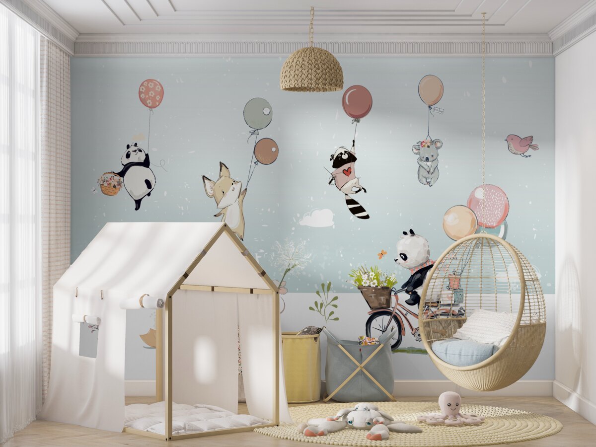 Tapeta Fototapeta Panda na rowerze i zwierzęta z balonami (artykuł a96651 ) z kategorii Fototapety dla Dzieci
