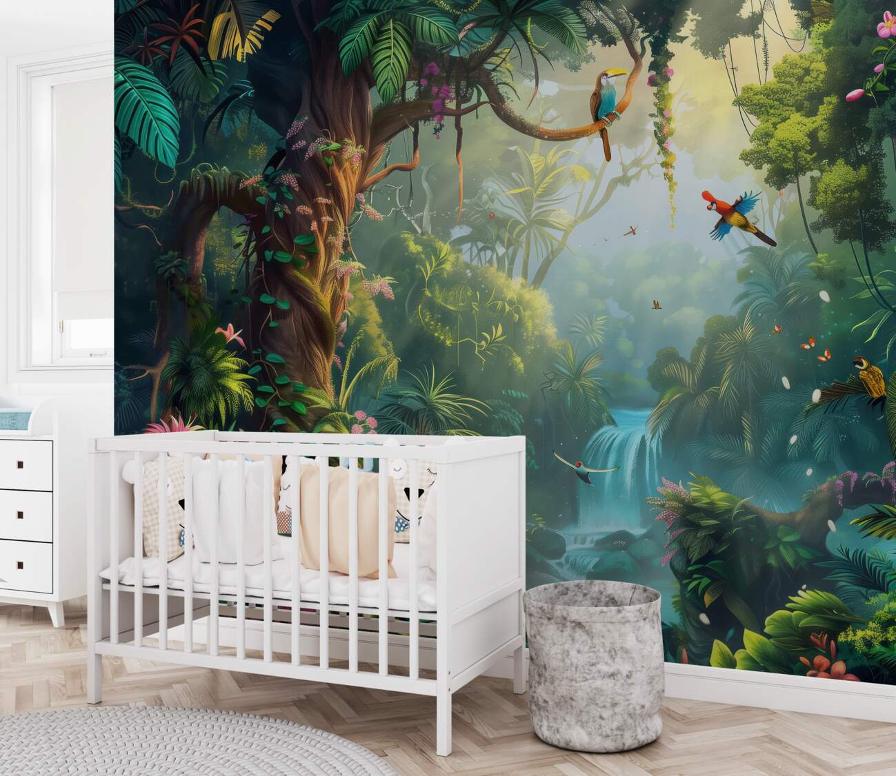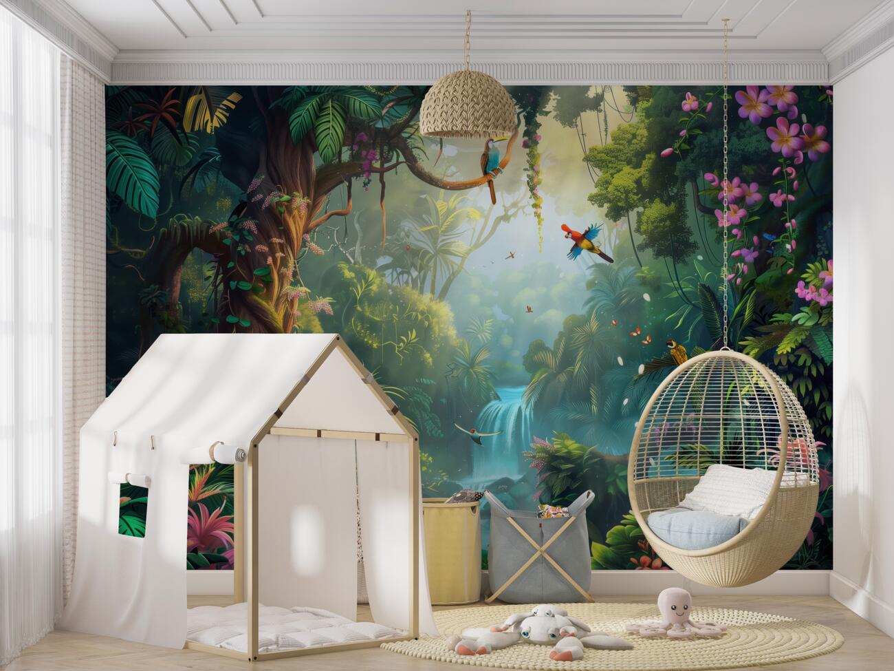 Tapeta Fototapeta Ptaki w tropikach na tle wodospadu (artykuł u14668 ) z kategorii Fototapety dla Dzieci