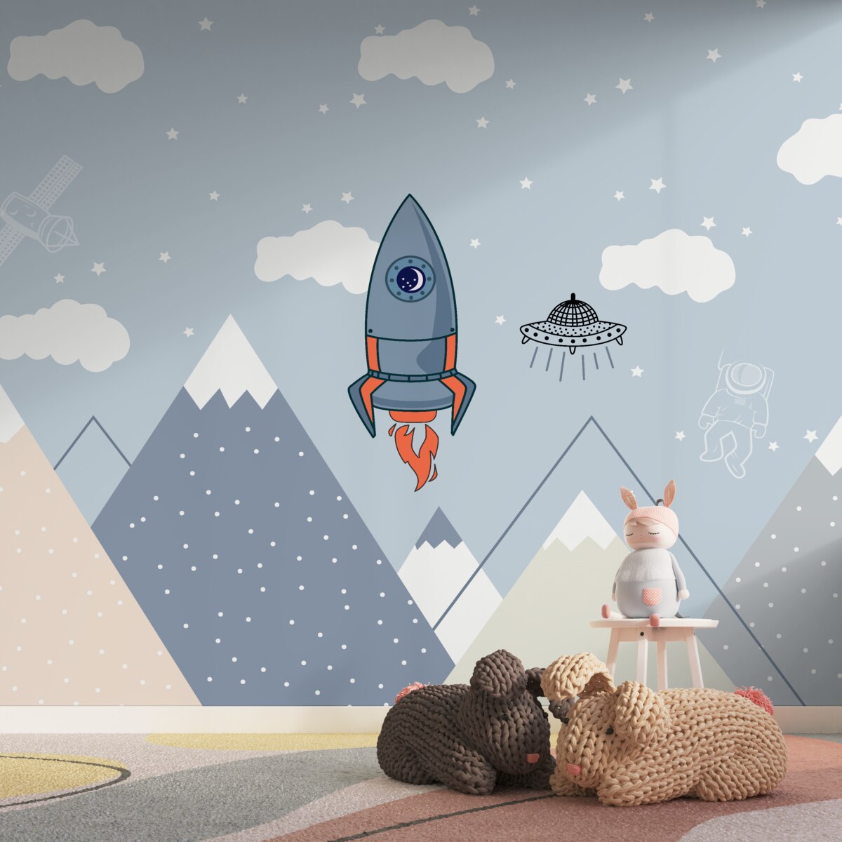 Tapeta Fototapeta Rakieta i UFO startują nad górami (artykuł a91532 ) z kategorii Fototapety dla Dzieci