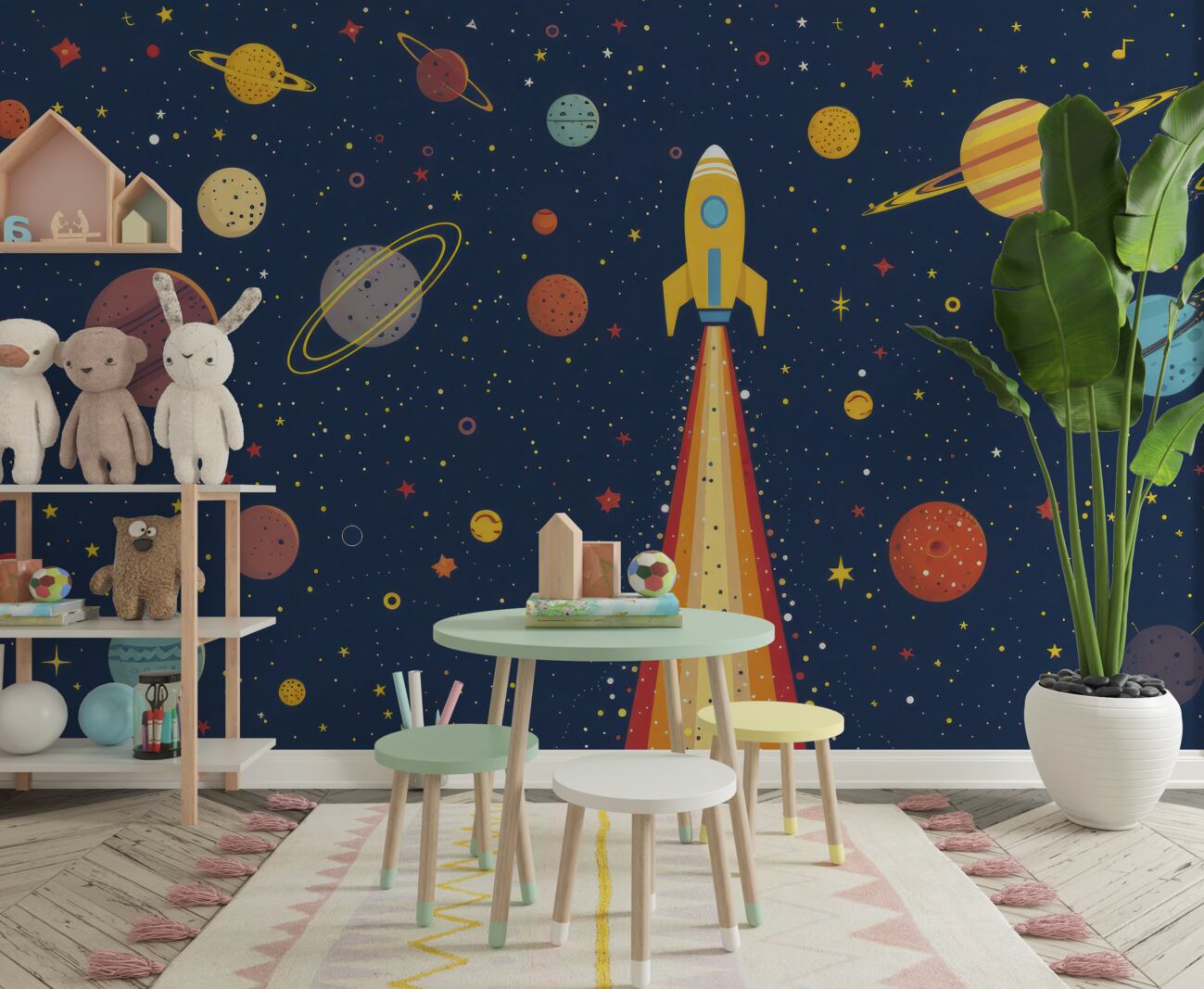 Tapeta Fototapeta Rakieta otoczona różnymi planetami (artykuł u14533 ) z kategorii Fototapety dla Dzieci