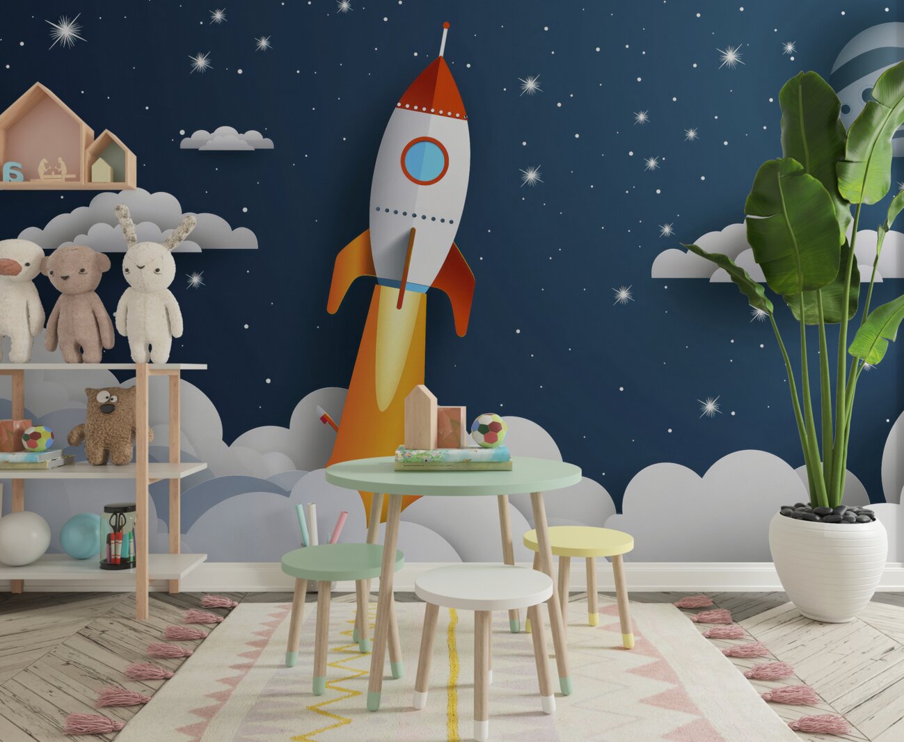Tapeta Fototapeta Rakieta wśród chmur i gwiaździstego nieba (artykuł u14552 ) z kategorii Fototapety dla Dzieci