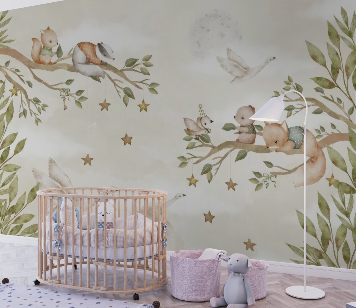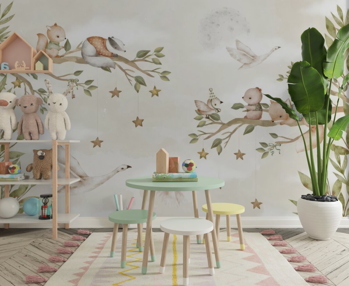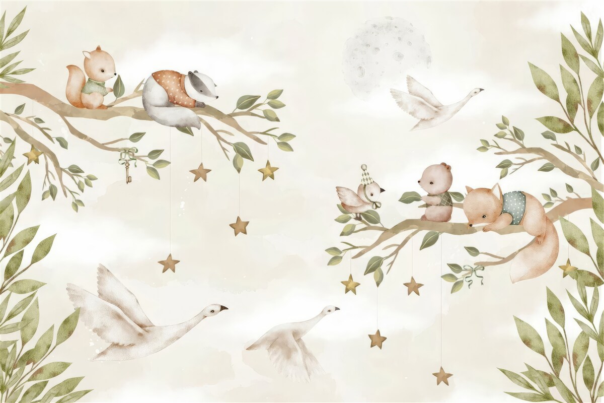 Tapeta Fototapeta Różne zwierzęta siedzące na gałęziach drzew (artykuł a97895 ) z kategorii Fototapety dla Dzieci
