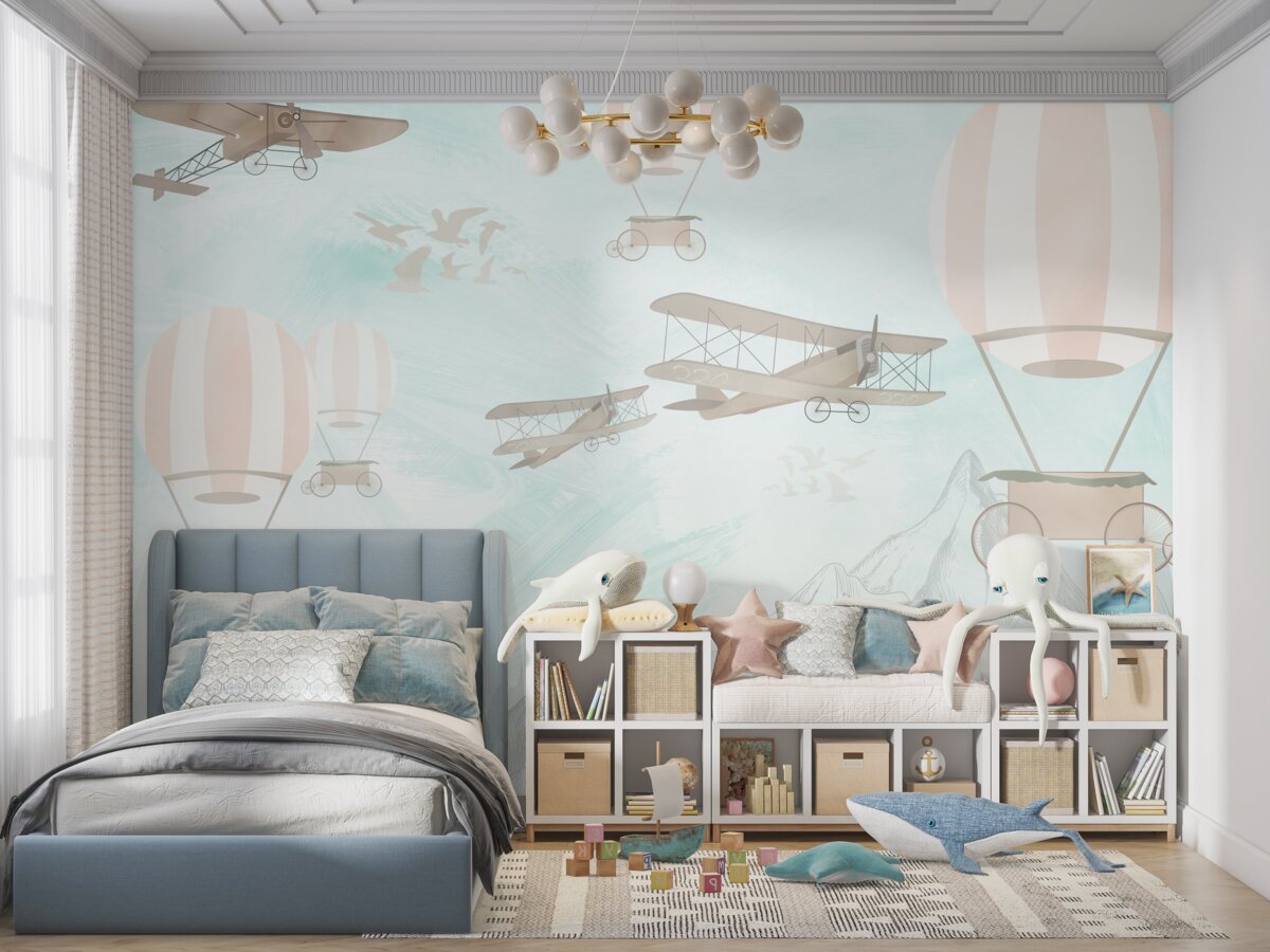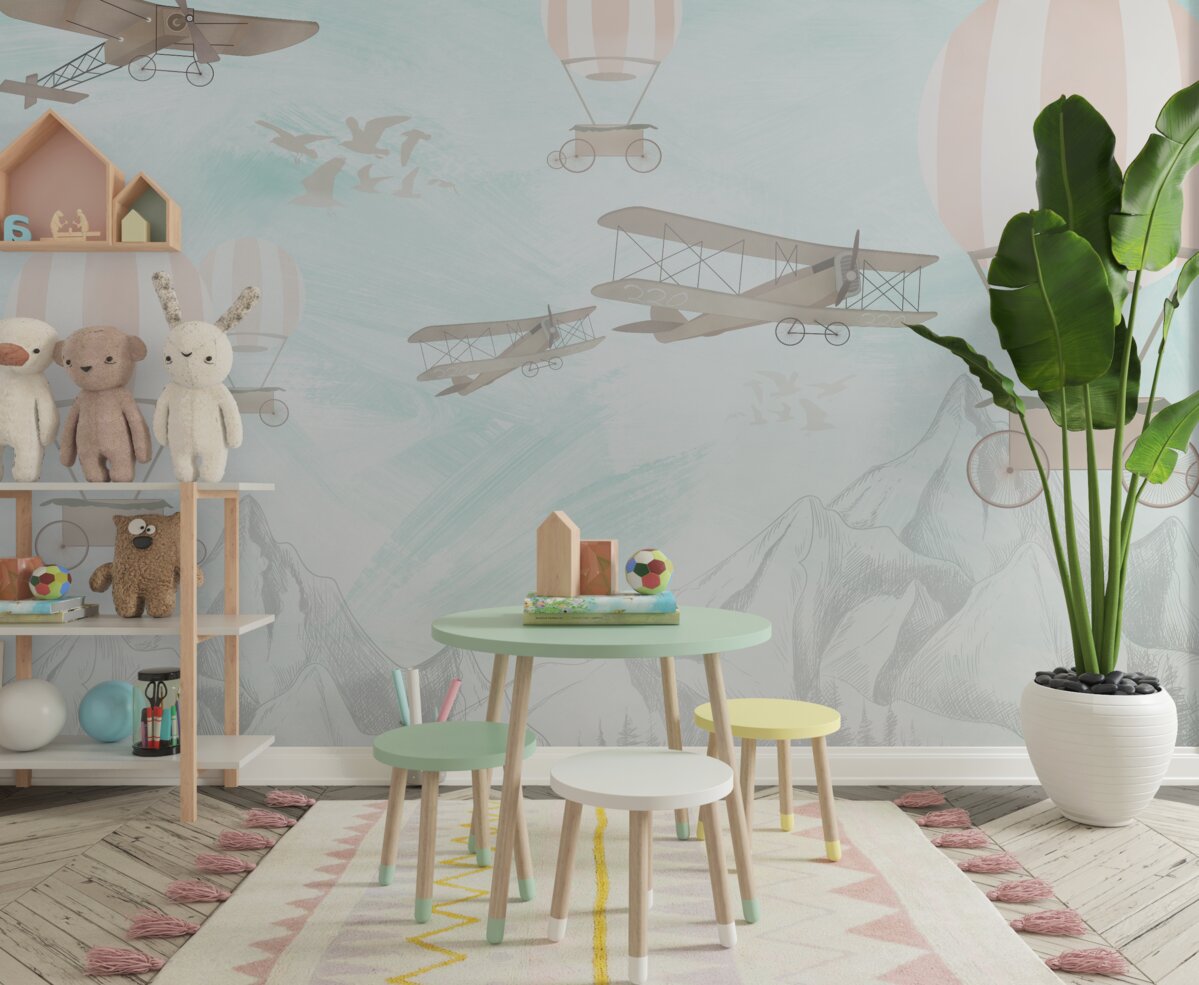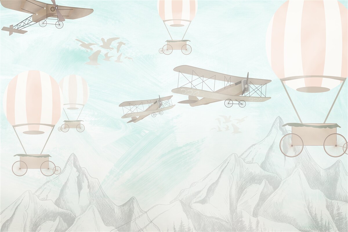 Tapeta Fototapeta Samoloty i balony latają nad górami (artykuł a98144 ) z kategorii Fototapety dla Dzieci