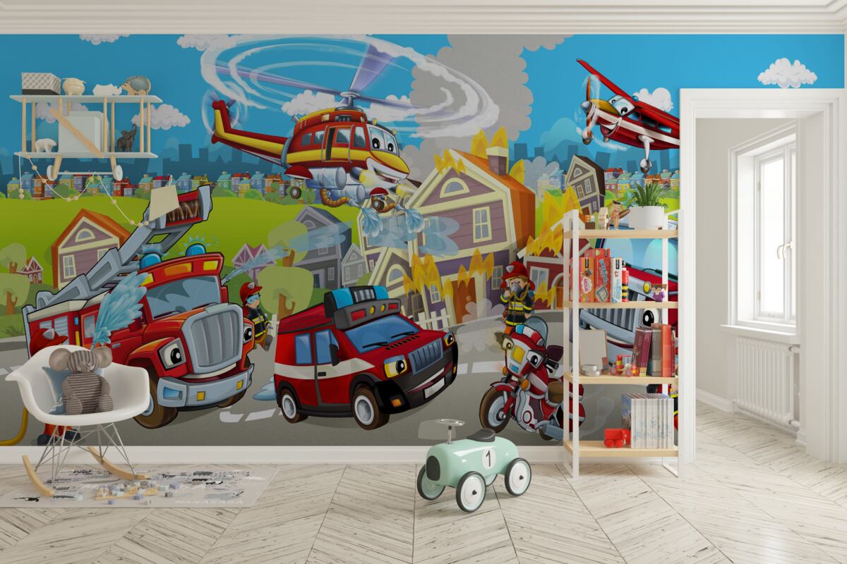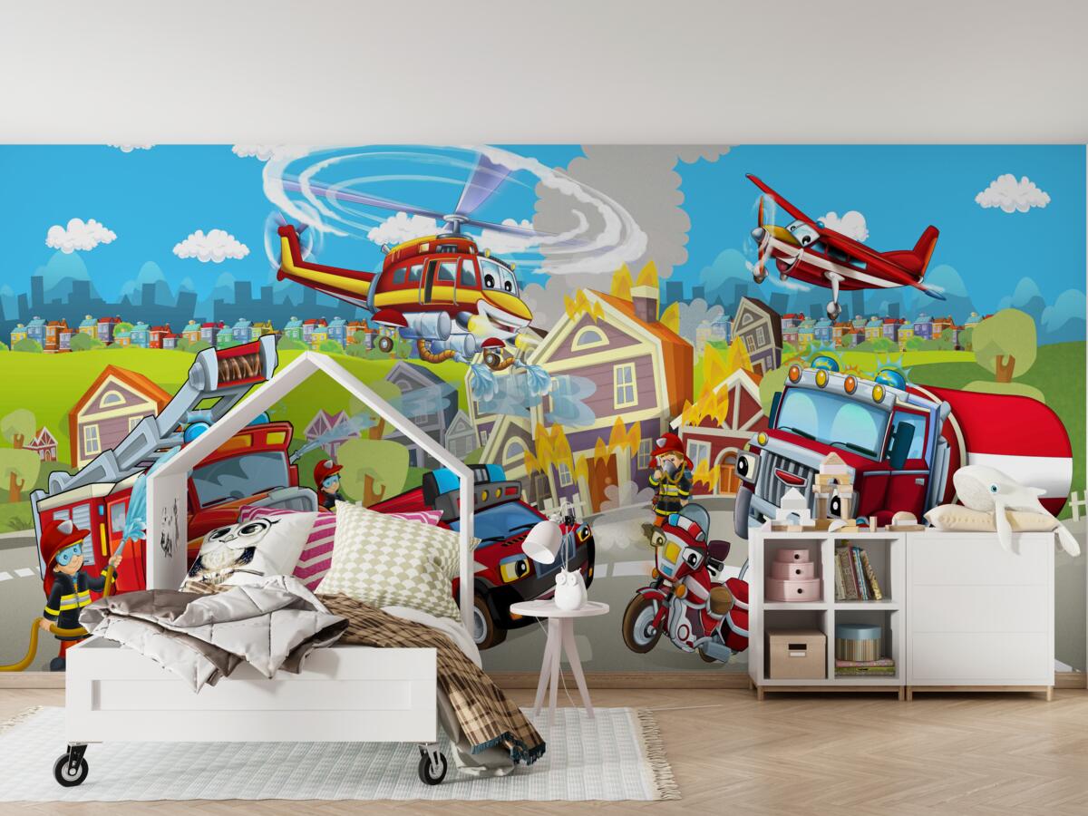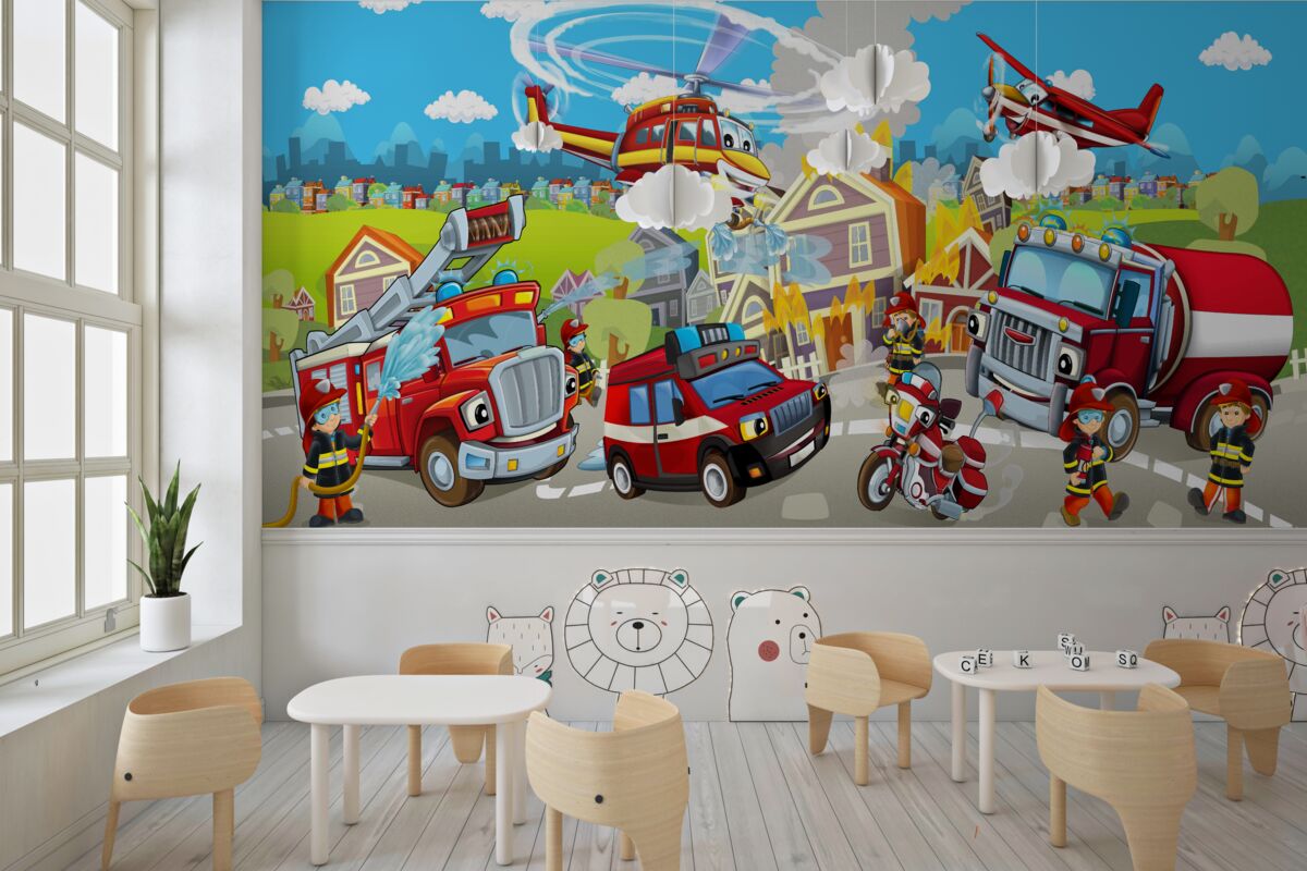 Tapeta Fototapeta Strażacy i różne pojazdy (artykuł a96685 ) z kategorii Fototapety dla Dzieci