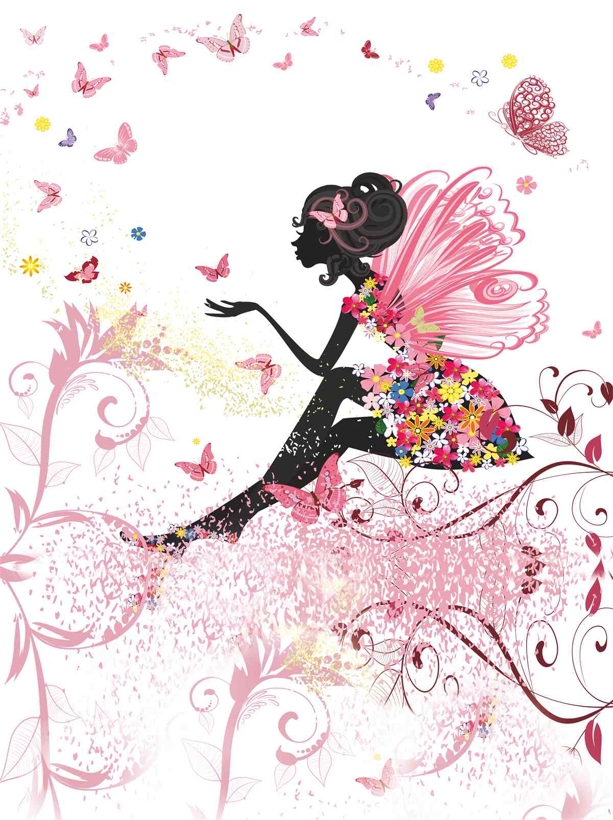 Tapeta Fototapeta Sylwetka dziewczyny w motylach i kwiatach (artykuł a96691 ) z kategorii Fototapety dla Dzieci