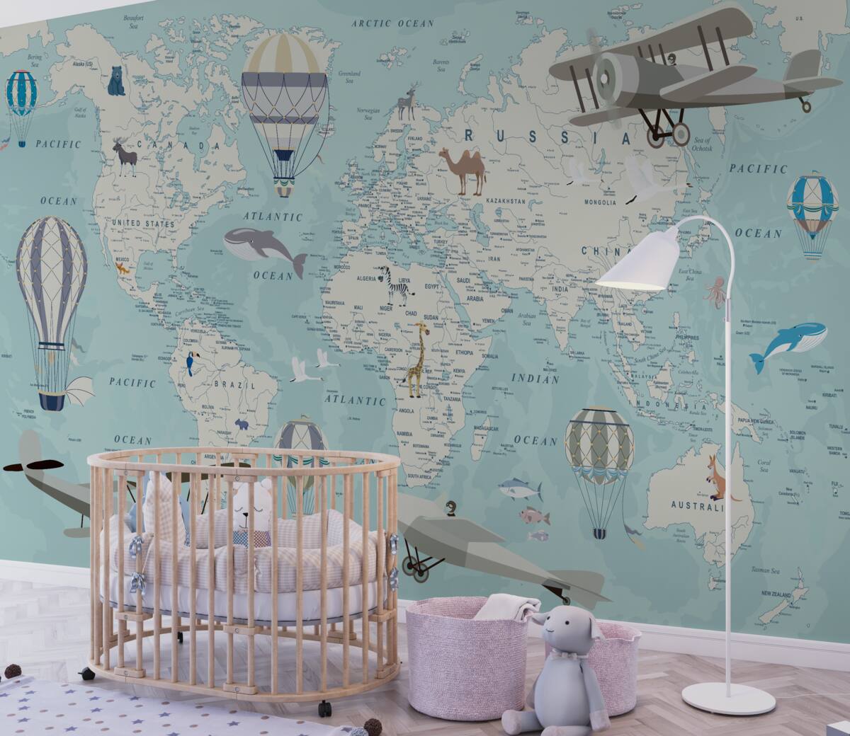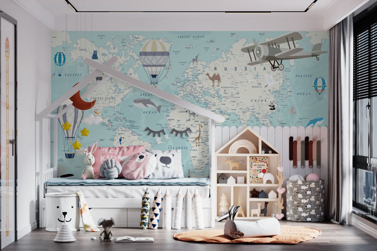 Tapeta Fototapeta Szczegółowa mapa świata z samolotami i balonami (artykuł a98055 ) z kategorii Fototapety dla Dzieci
