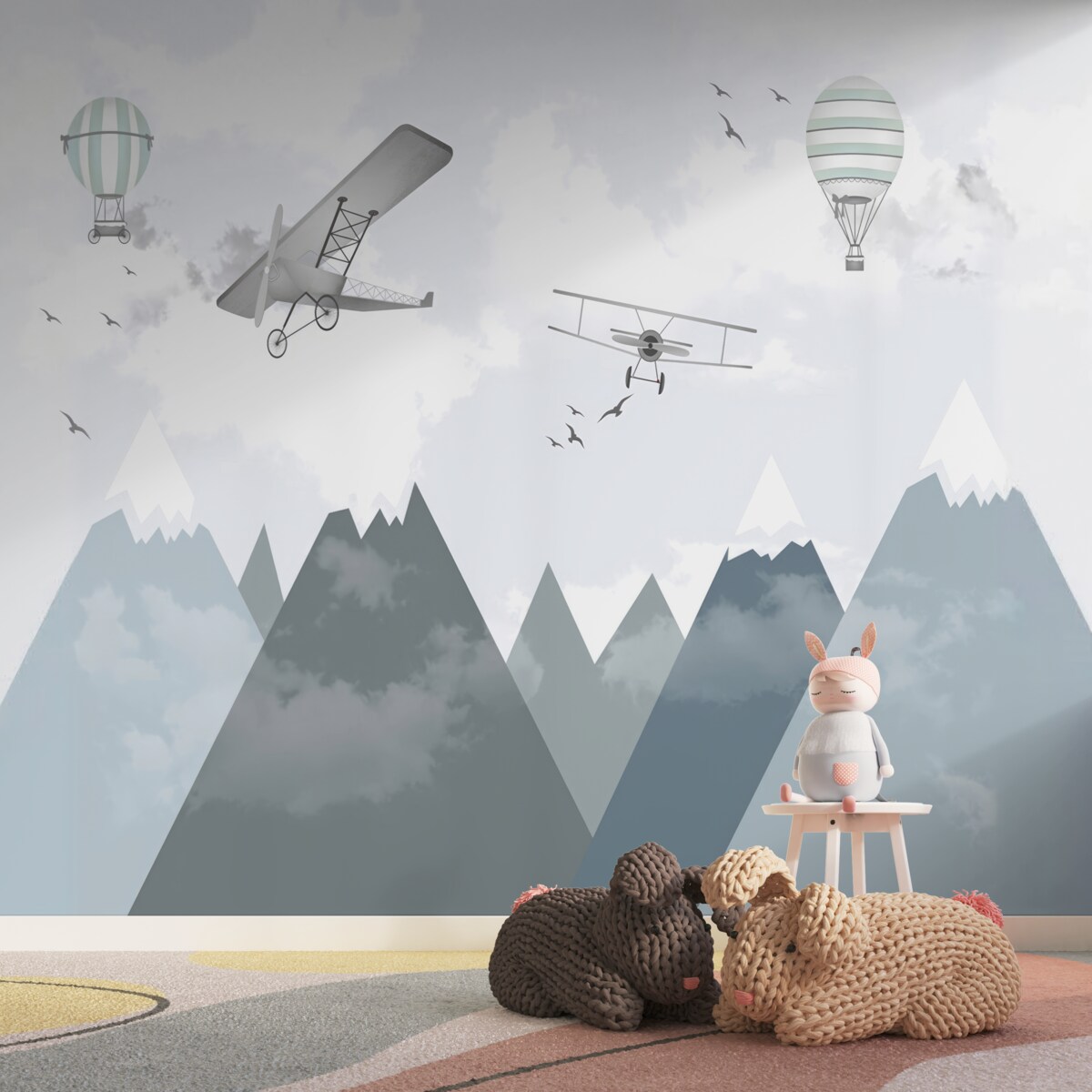 Tapeta Fototapeta Transport lotniczy leci nad górami (artykuł a97669 ) z kategorii Fototapety dla Dzieci