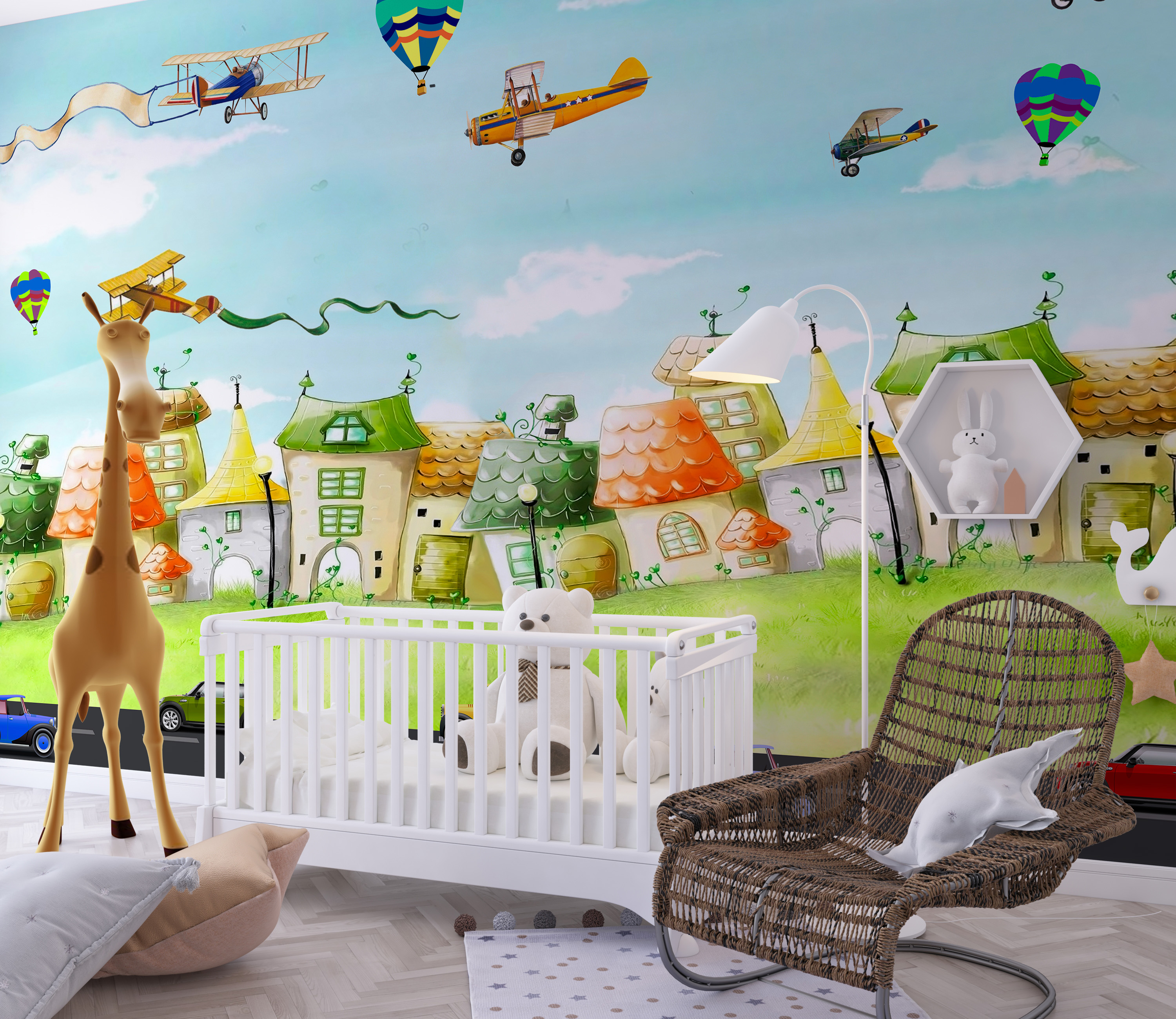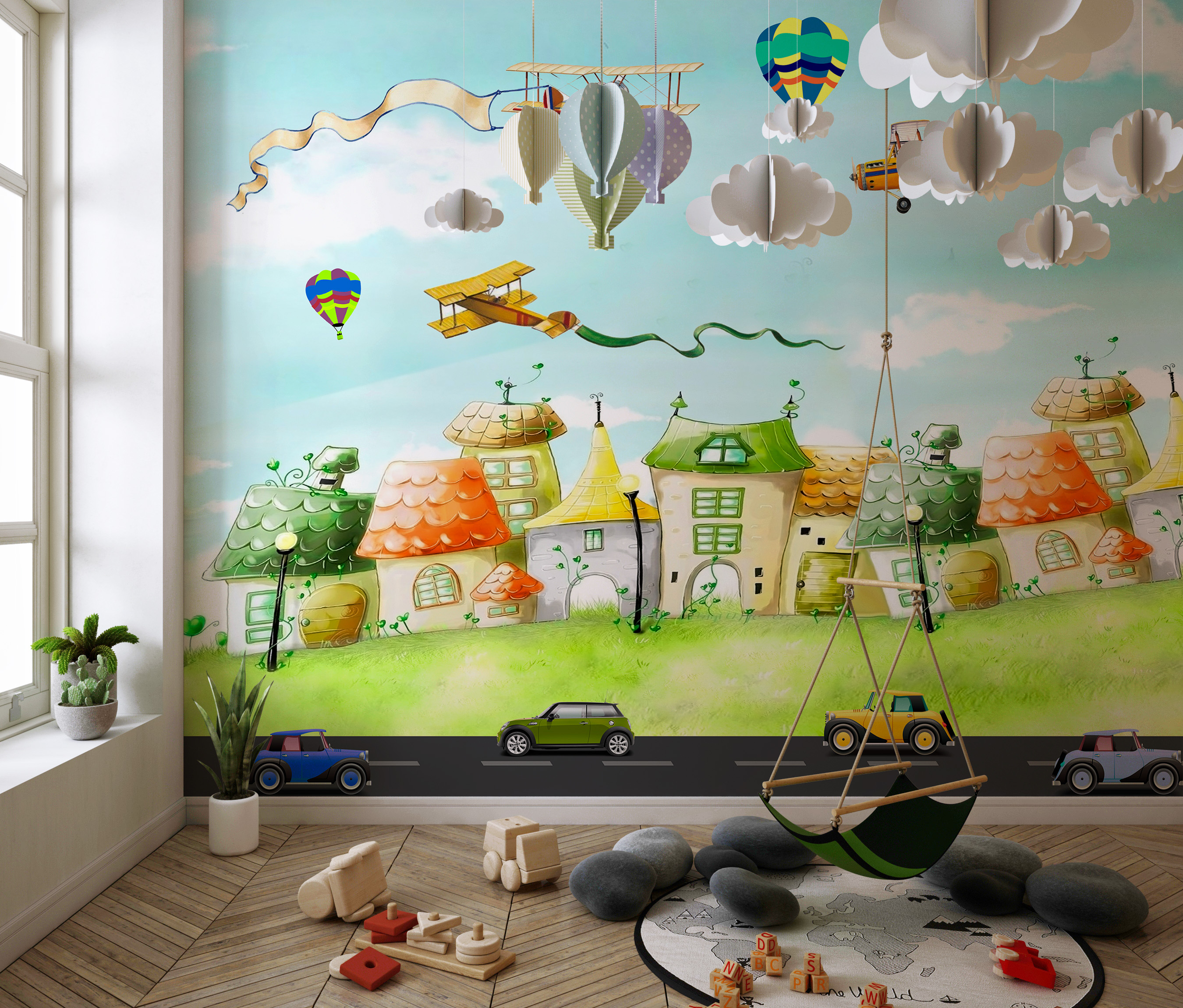 Tapeta Fototapeta Transport na tle bajecznego miasta (artykuł a94012 ) z kategorii Fototapety dla Dzieci