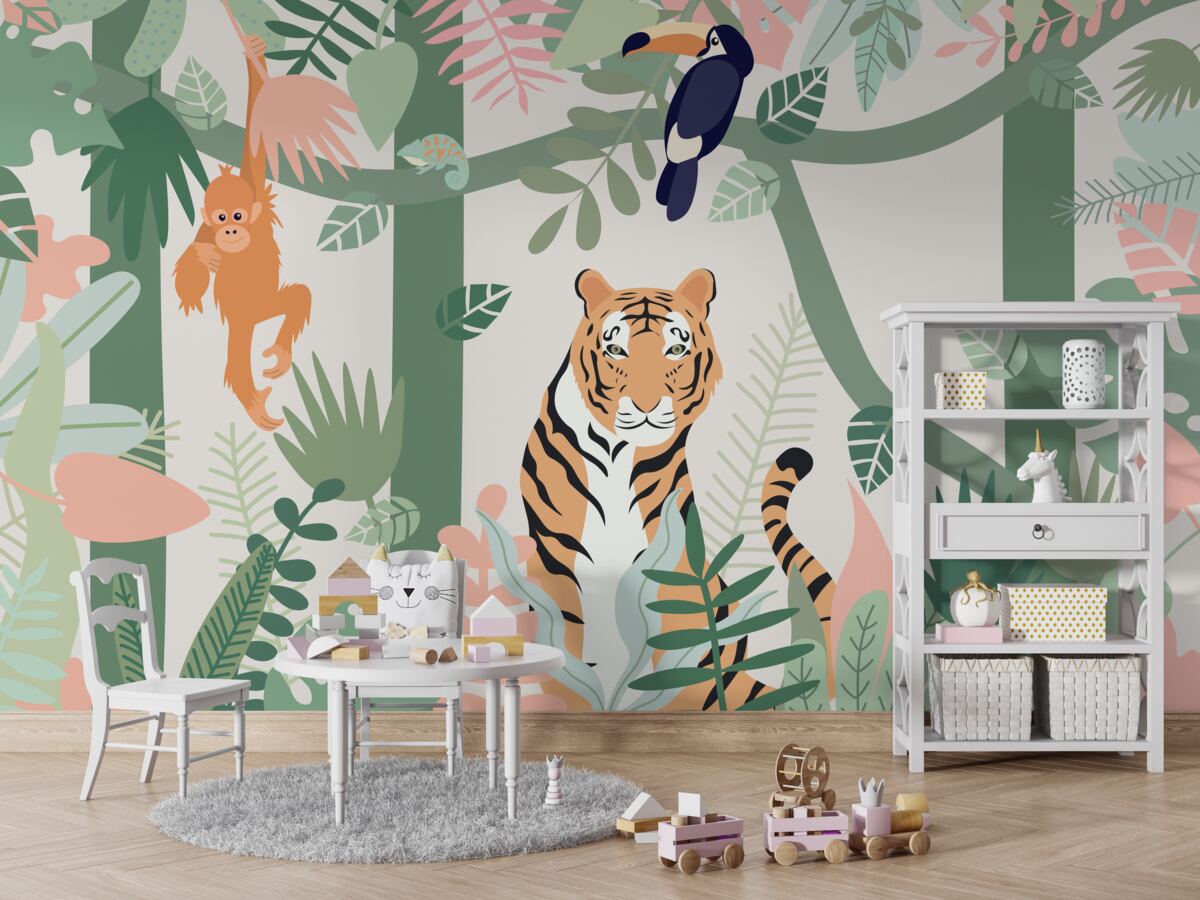Tapeta Fototapeta Tygrys i jego przyjaciele w lesie (artykuł a98127 ) z kategorii Fototapety dla Dzieci