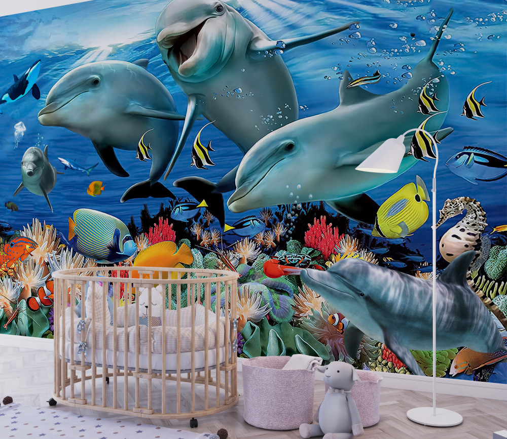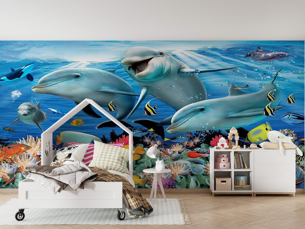 Tapeta Fototapeta uśmiechnięte delfiny i ryby pod wodą (artykuł a93929 ) z kategorii Fototapety dla Dzieci