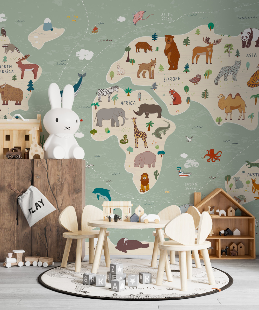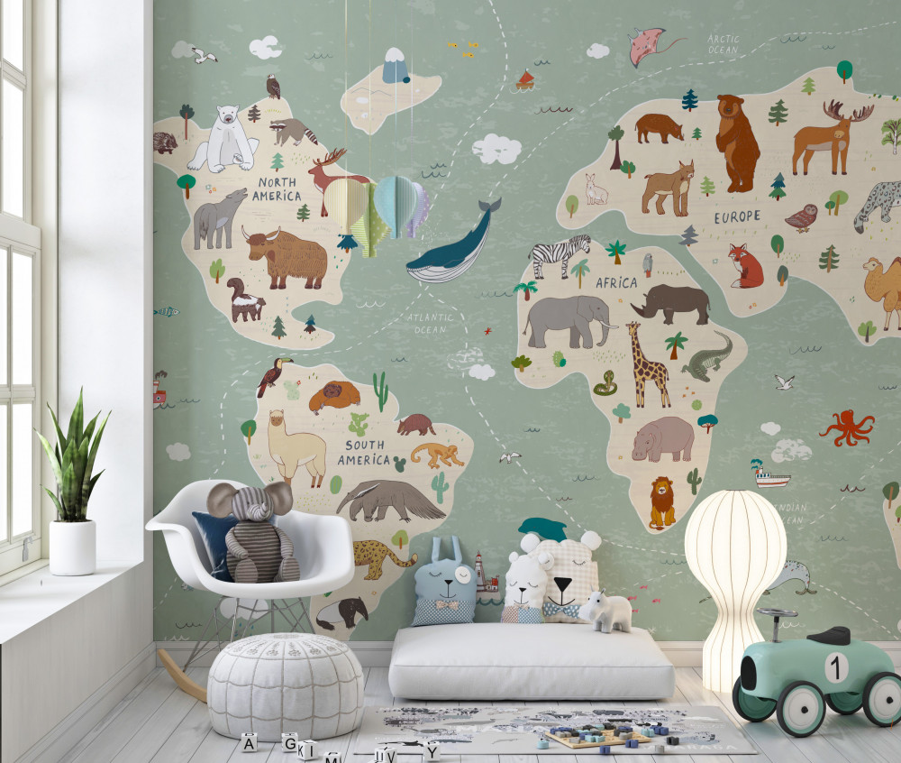 Tapeta Fototapeta wiele zwierząt na mapie świata (artykuł a93832 ) z kategorii Fototapety dla Dzieci