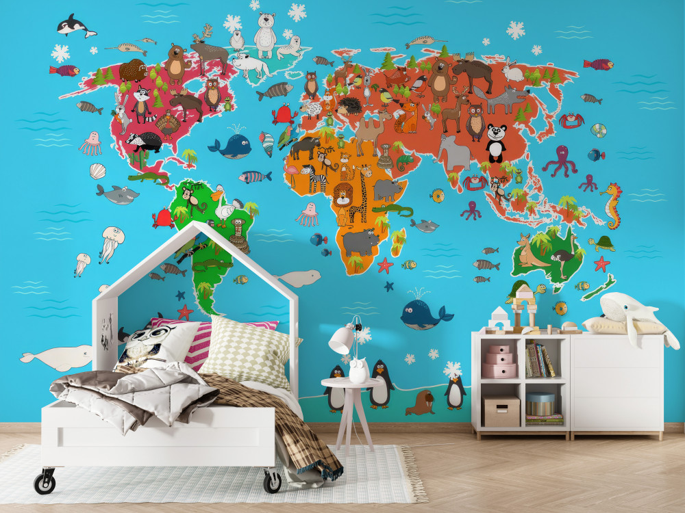 Tapeta Fototapeta wiele zwierząt na szczegółowej mapie świata (artykuł a92901 ) z kategorii Fototapety dla Dzieci