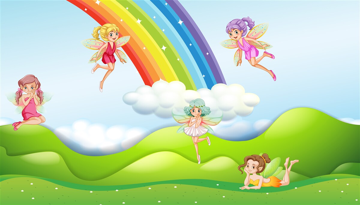 Tapeta Fototapeta Wróżki cieszą się z tęczy (artykuł a98043 ) z kategorii Fototapety dla Dzieci