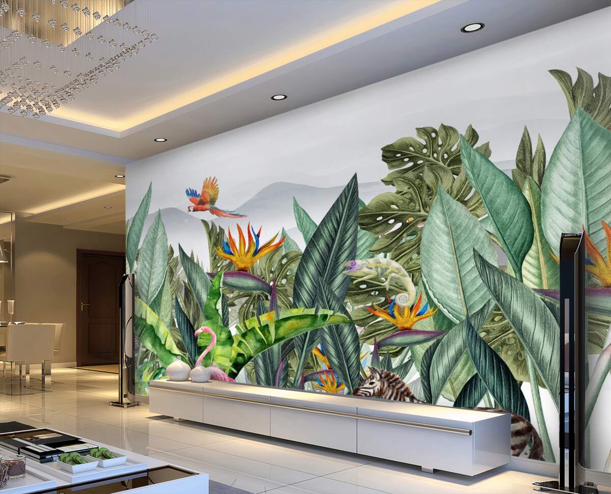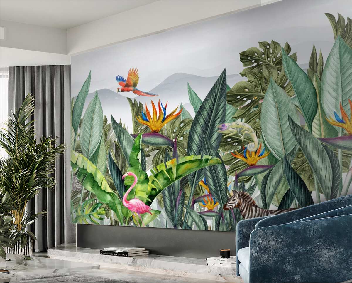Fototapeta Zielone różne rośliny ze zwierzętami i ptakami