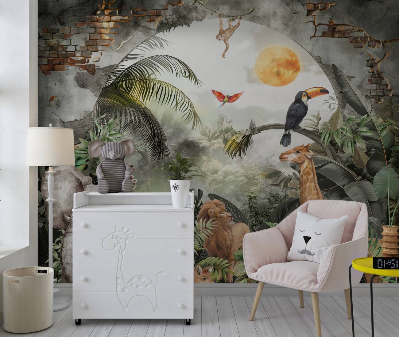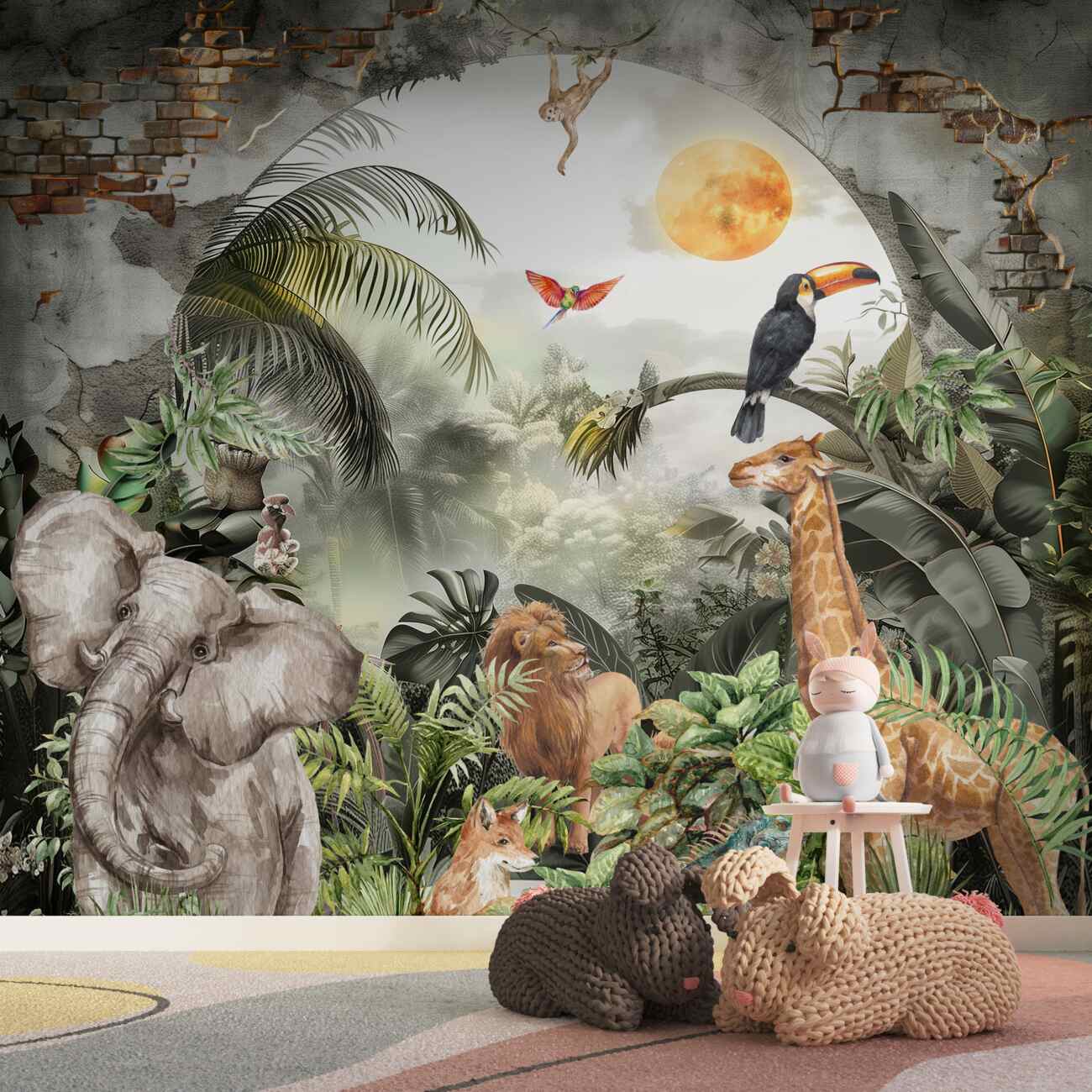 Tapeta Fototapeta Zwierzęta i ptaki na tle ceglanego łuku (artykuł a100118 ) z kategorii Fototapety dla Dzieci