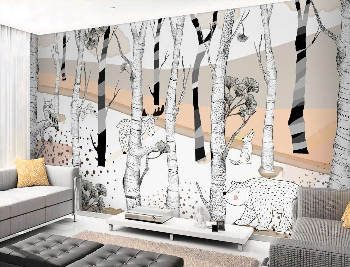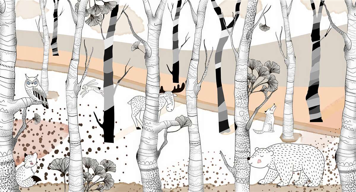 Tapeta Fototapeta Zwierzęta malowane wśród drzew (artykuł a97853 ) z kategorii Fototapety dla Dzieci