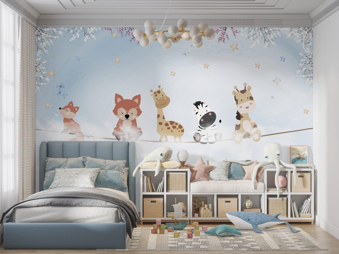 Tapeta Fototapeta Zwierzęta siedzą na rozciągniętej linie (artykuł a100004 ) z kategorii Fototapety dla Dzieci