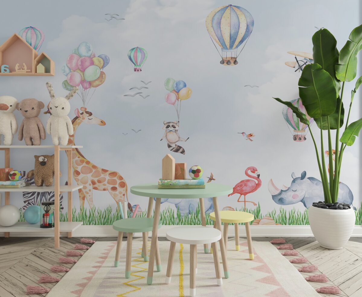 Tapeta Fototapeta Zwierzęta spacerują wśród balonów (artykuł a96668 ) z kategorii Fototapety dla Dzieci