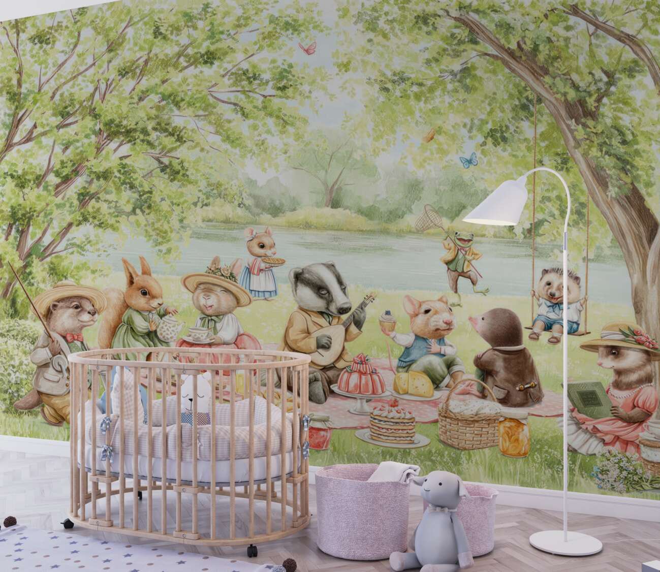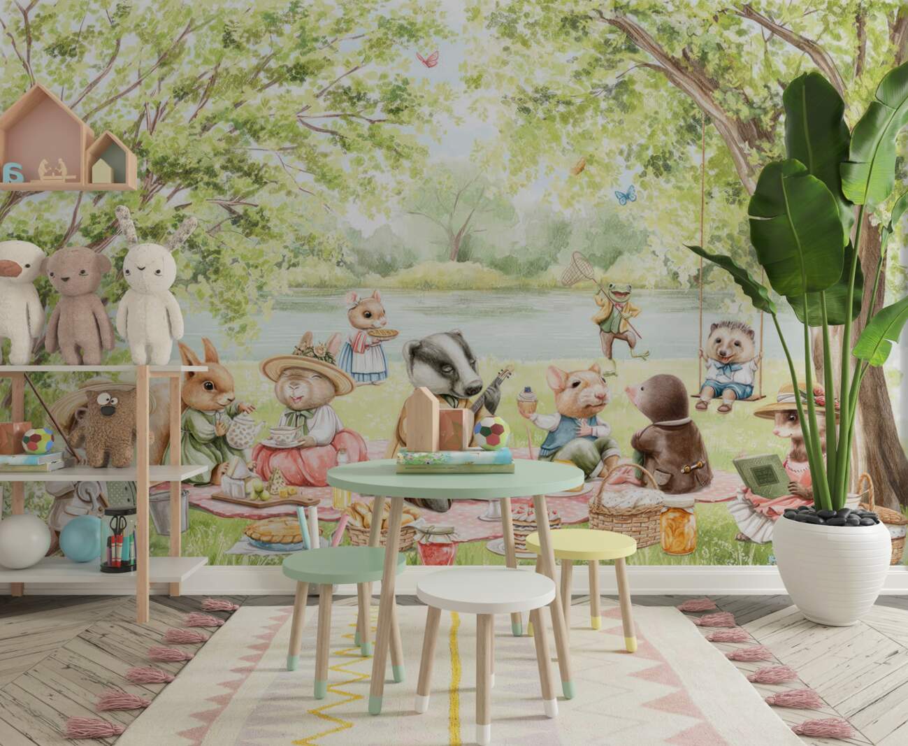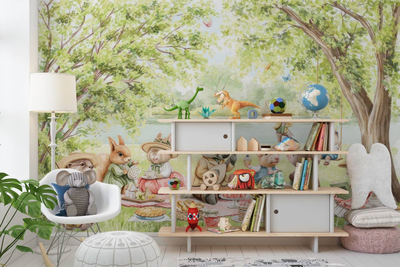 Tapeta Fototapeta Zwierzęta w trawniku za wodą ułożone piknik (artykuł a100044 ) z kategorii Fototapety dla Dzieci