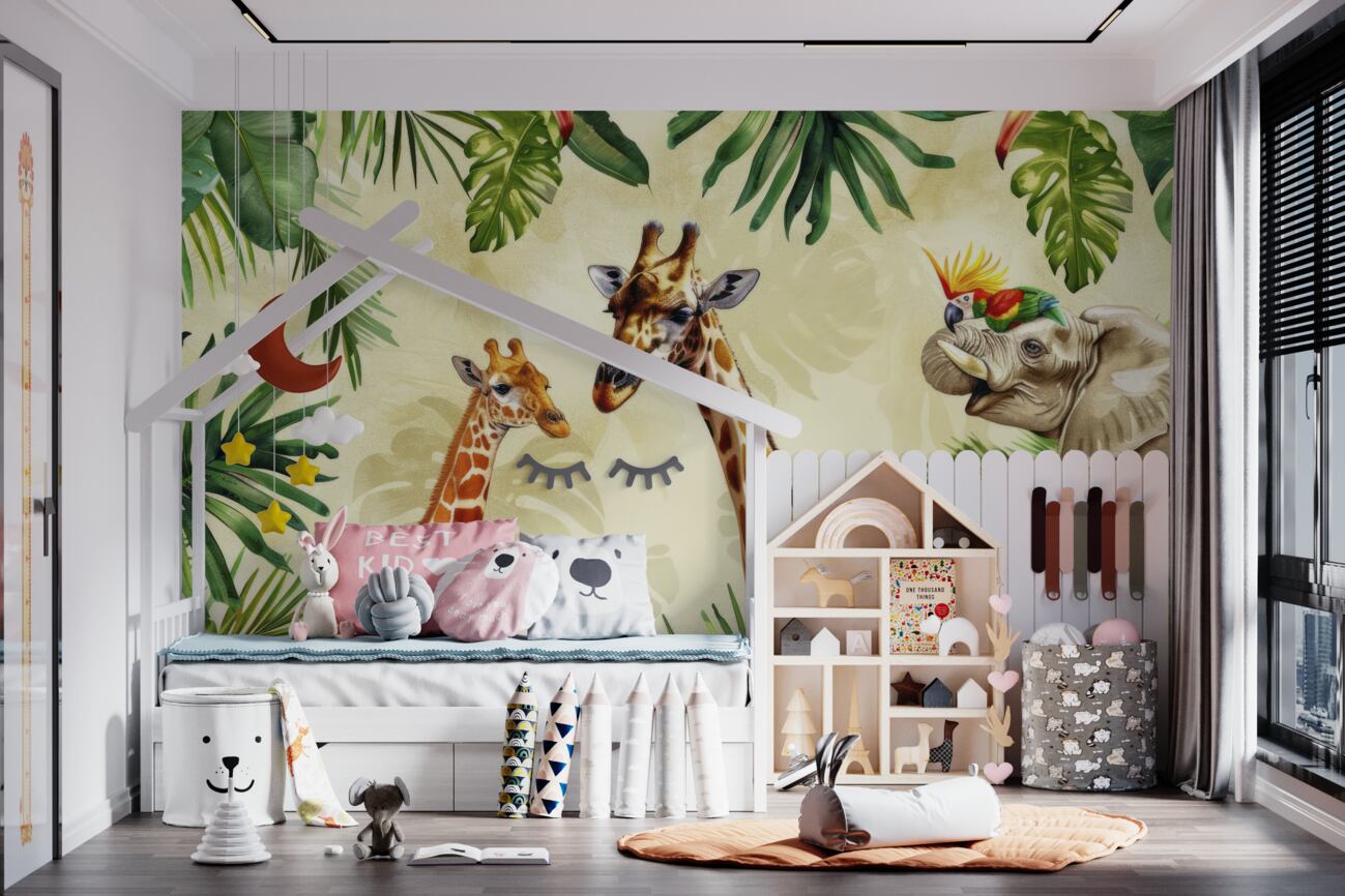 Tapeta Fototapeta Żyraf, słonie i papugi w liściach palmowych (artykuł u14601 ) z kategorii Fototapety dla Dzieci