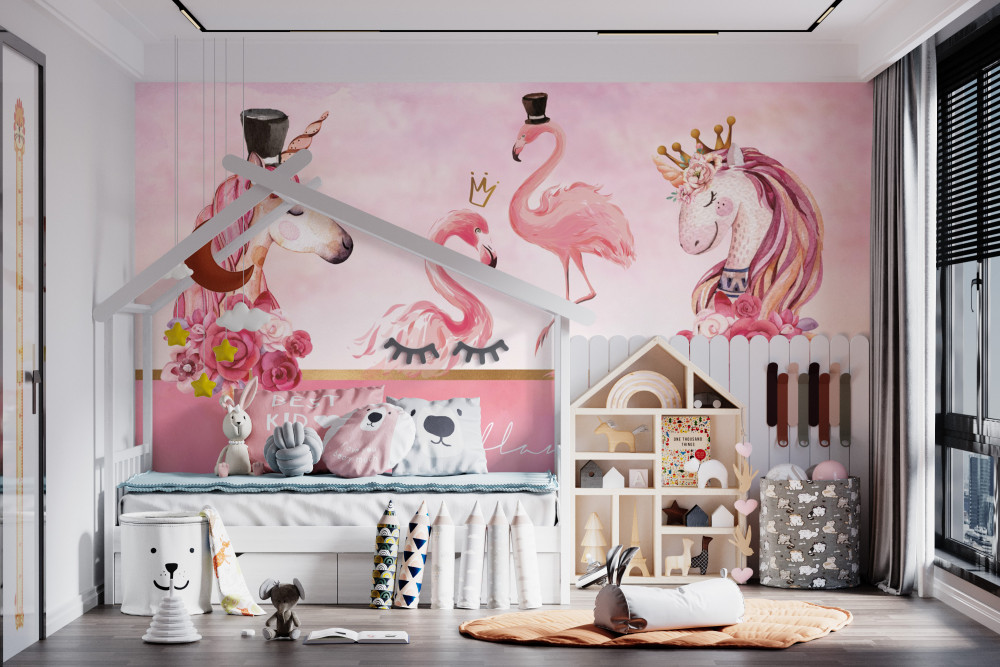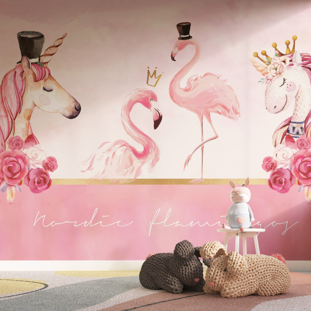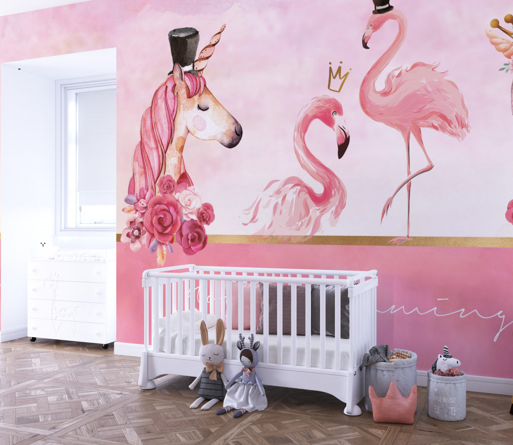 Tapeta Fototapeta jednorożce i różowe flamingi (artykuł a89868 ) z kategorii Fototapety dla Dziewczynek