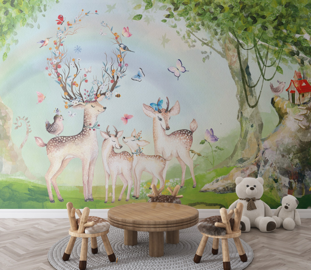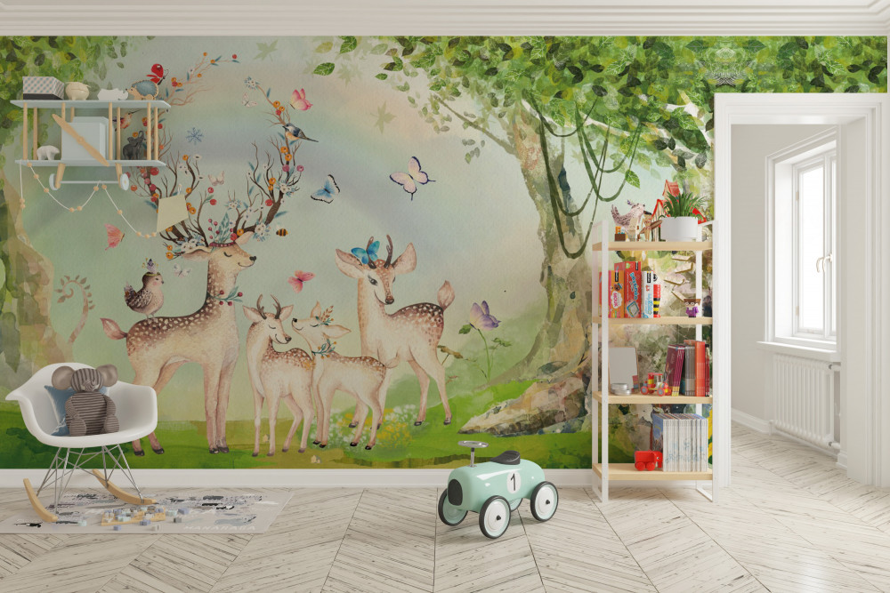 Tapeta Fototapeta rodzina jeleni w bajkowym lesie (artykuł a89806 ) z kategorii Fototapety dla Dziewczynek
