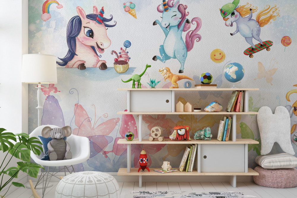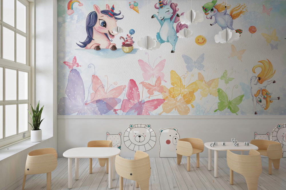 Tapeta Fototapeta śmieszne jednorożce i motyle (artykuł a89845 ) z kategorii Fototapety dla Dziewczynek