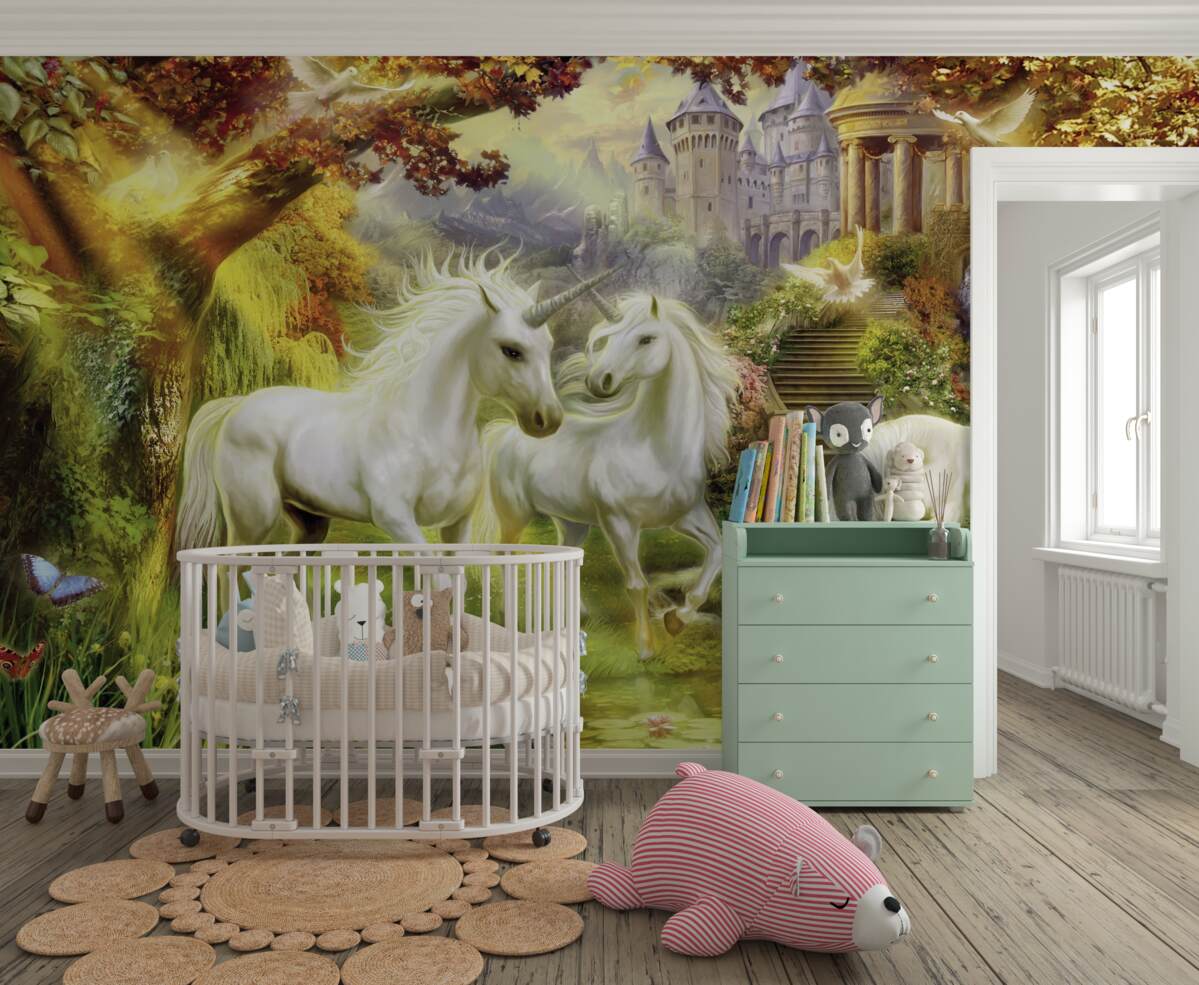 Tapeta Fototapeta Śnieżnobiałe jednorożce w lesie niedaleko zamku (artykuł a96708 ) z kategorii Fototapety Fantasy