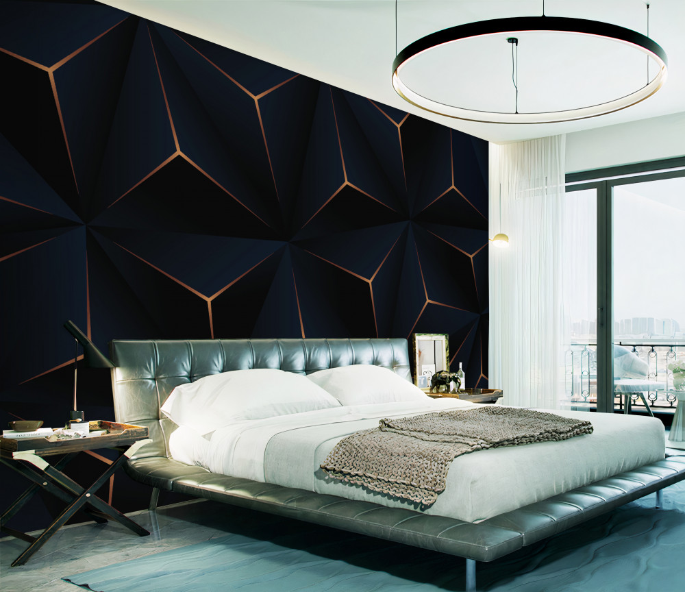 Tapeta Fototapeta czarne piramidy wolumetryczne ze złotymi krawędziami (artykuł a93135 ) z kategorii Fototapety Geometryczne