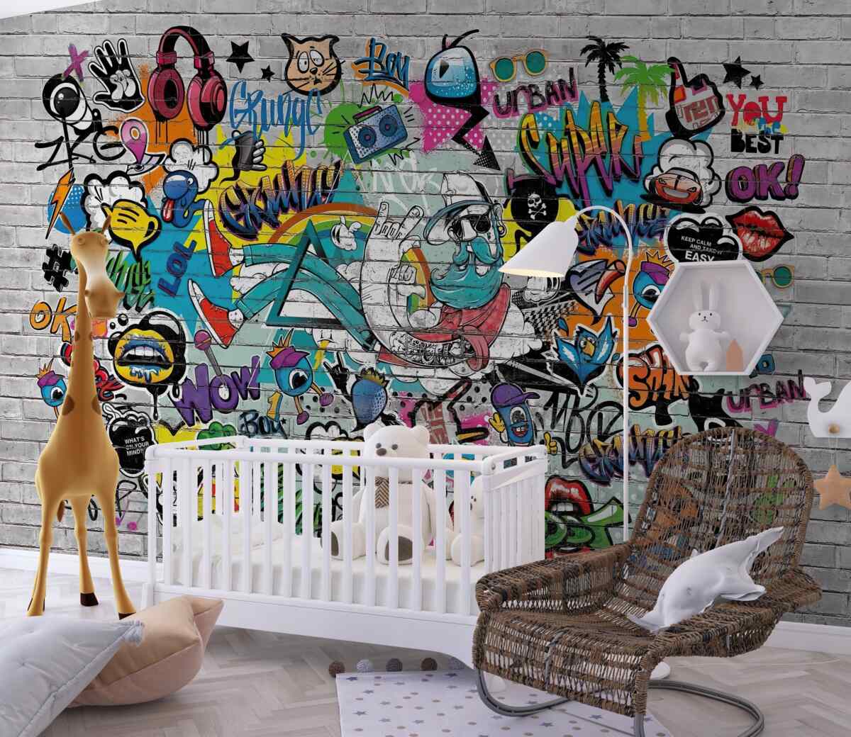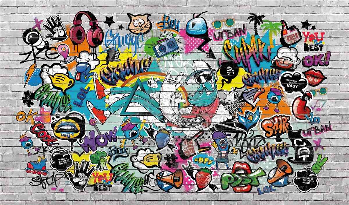 Tapeta Fototapeta Mur z cegieł z kolorowymi graffiti (artykuł a97263 ) z kategorii Fototapety Graffiti