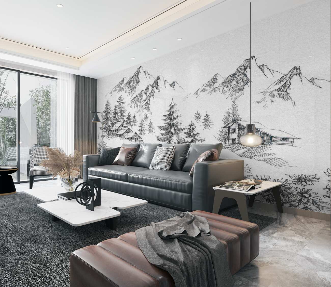 Tapeta Fototapeta Ilustracja wioski w górach czarnych białych (artykuł a99512 ) z kategorii Fototapety Ilustracje