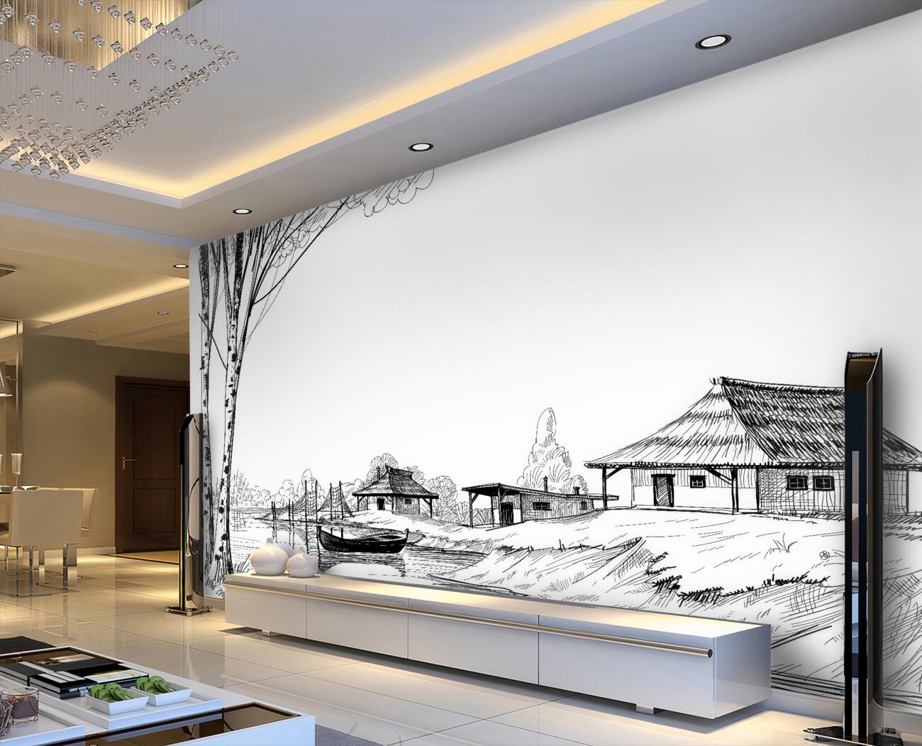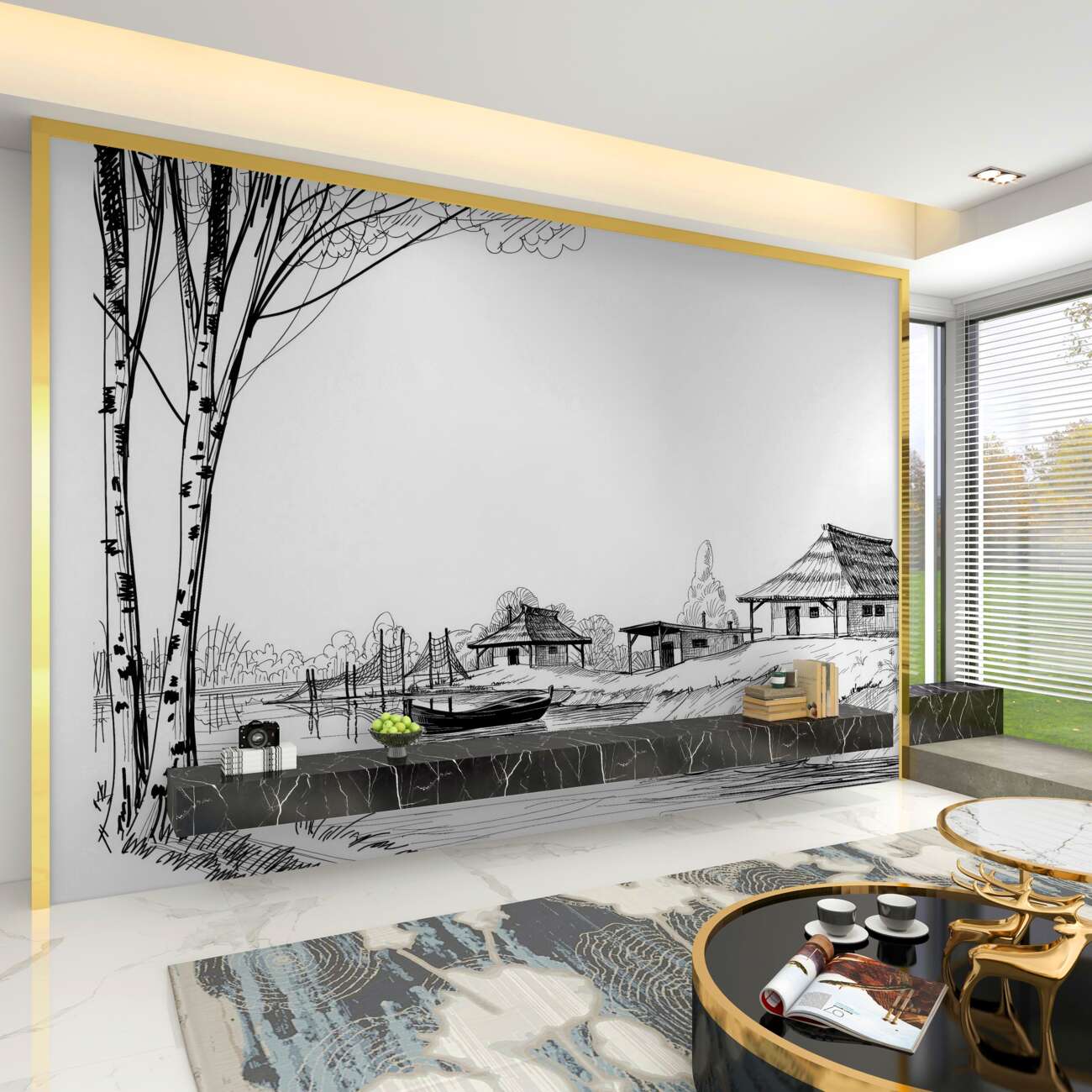 Tapeta Fototapeta Mała wioska w pobliżu wody czarnej białej (artykuł a99180 ) z kategorii Fototapety Ilustracje