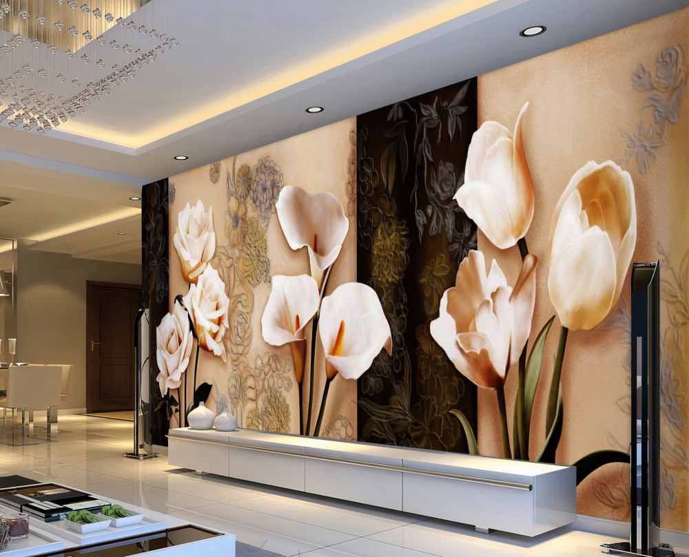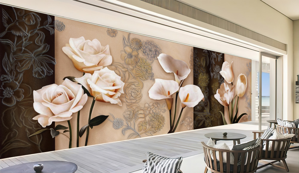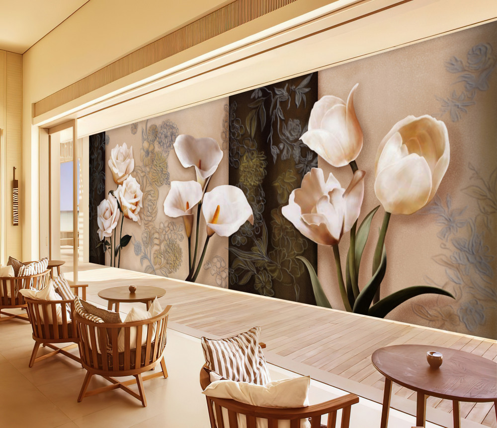 Tapeta Fototapeta beżowe róże, kalie i tulipany (artykuł a92324 ) z kategorii Fototapety Kwiaty 3D