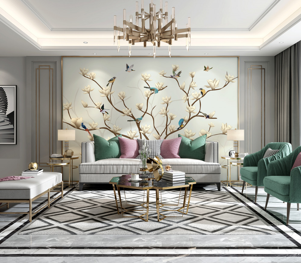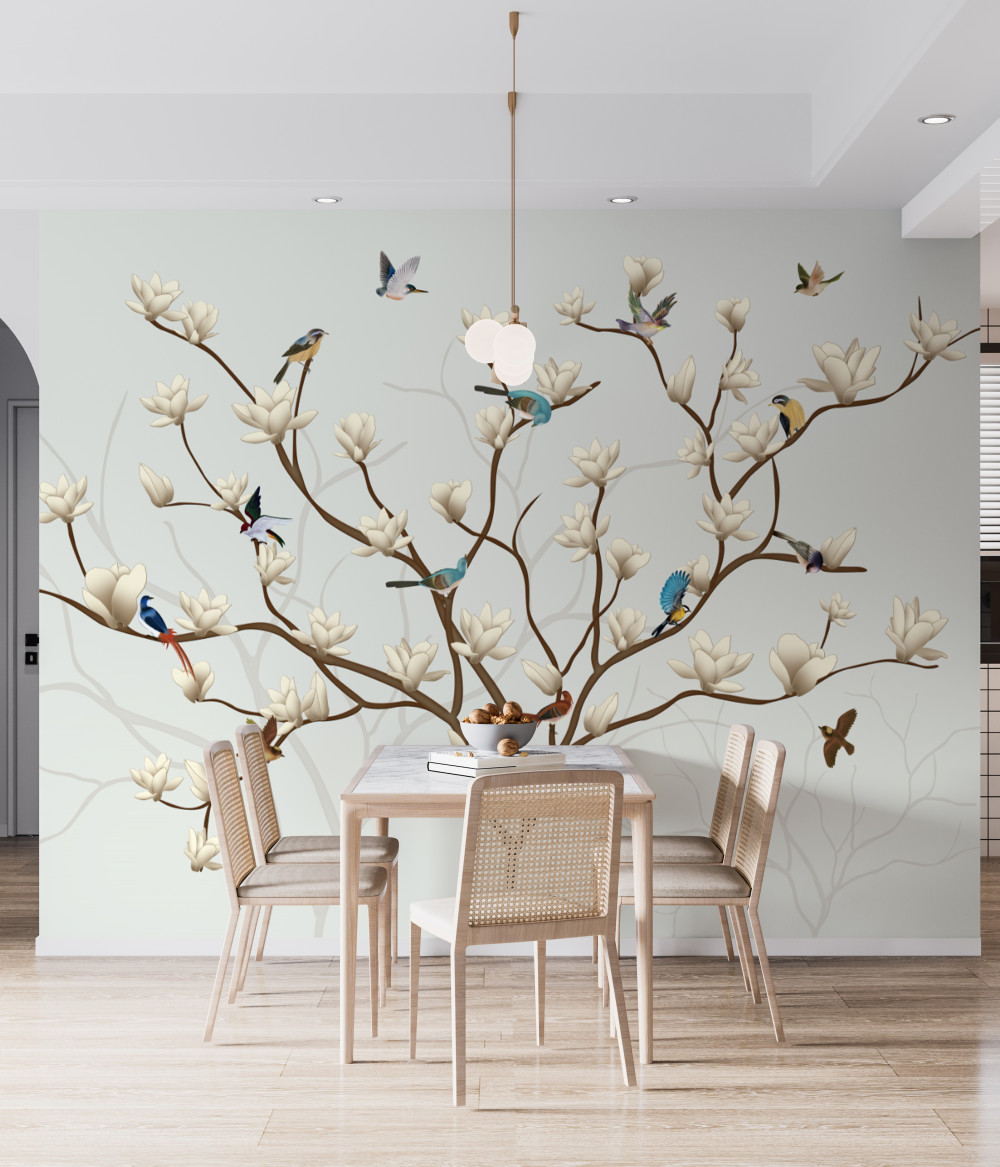 Tapeta Fototapeta biała magnolia z różnymi ptakami (artykuł a91779 ) z kategorii Fototapety Kwiaty 3D