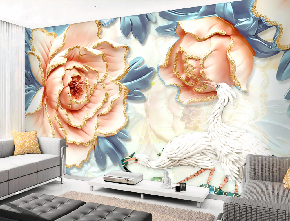 Tapeta Fototapeta białe łabędzie i brzoskwiniowe róże (artykuł pb6673 ) z kategorii Fototapety Kwiaty 3D
