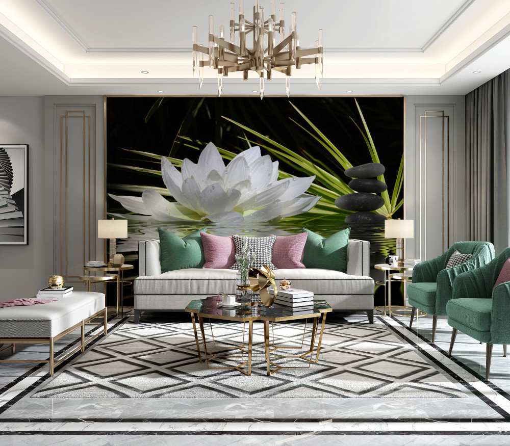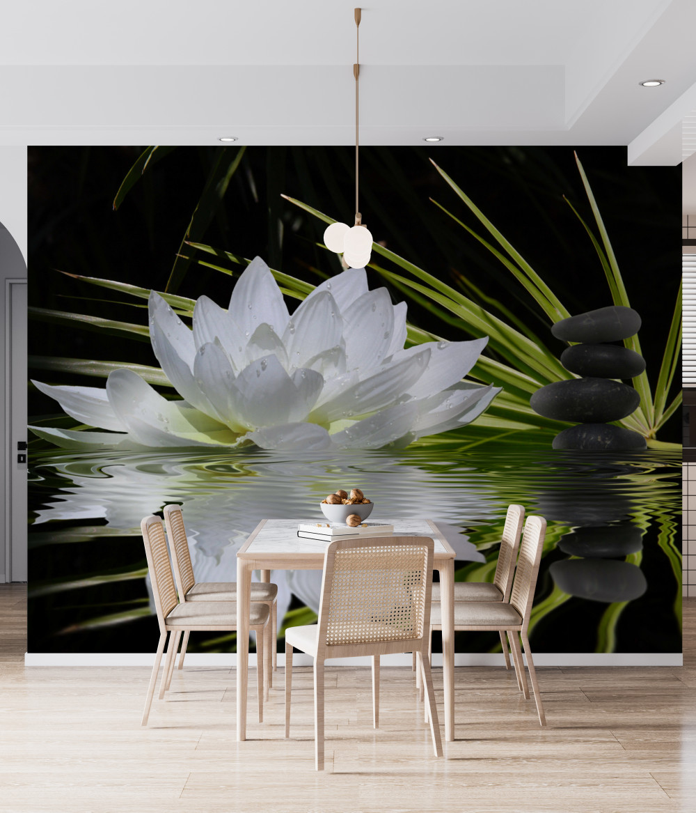 Tapeta Fototapeta białe lilie wodne i szare kamienie na wodzie (artykuł a92399 ) z kategorii Fototapety Kwiaty 3D