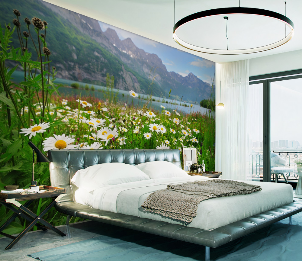 Tapeta Fototapeta górski krajobraz z polem stokrotek (artykuł a88440 ) z kategorii Fototapety Kwiaty 3D